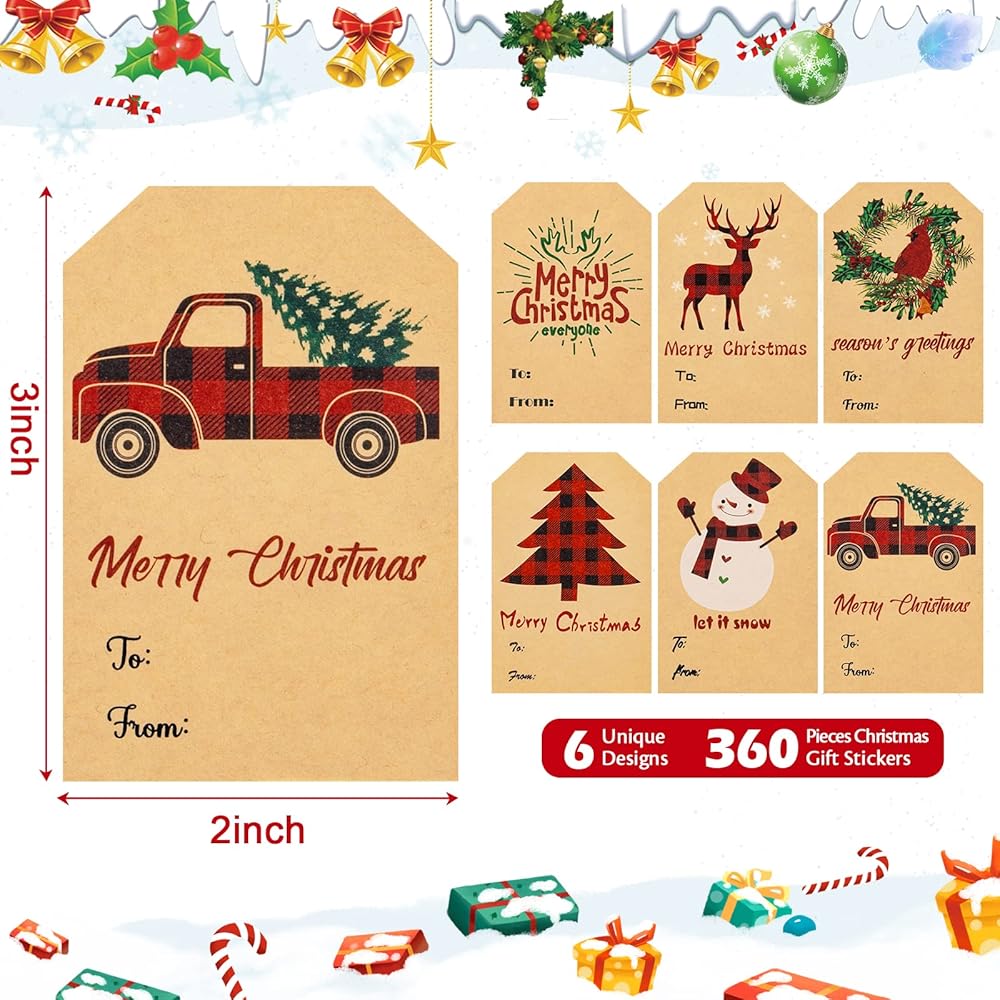 Package and Size: 360 pieces a roll of Christmas gift tag stickers hot stamping 3 inch x 2 inch, include 6 different designs, 60 pieces of each patter. Enough quantity would meet your needs of give Christmas gifts or decorations.