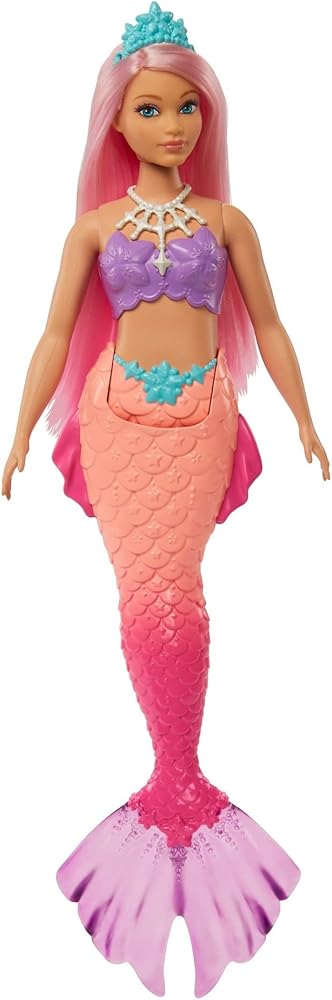 This Barbie mermaid doll features a beautiful pastel pink bodice, translucent fin and a pink and blue ombre tail with sculpted star details.
