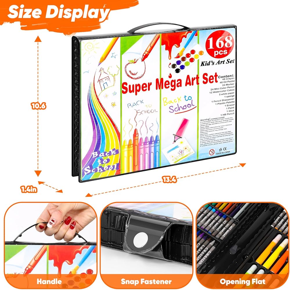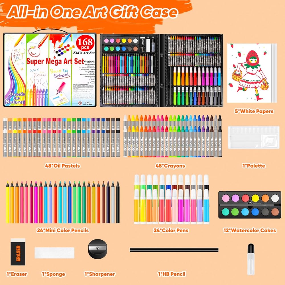 【Complete 168-Pack Art Set】This Art Kit, Art Supplies, Drawing Kit, Drawing Supplies, Drawing Set, Coloring Kit, Arts Crafts for Kids Ages 6-8-9-12, Gift Box for Kids Girls Boys, from oil pastels and colored pencils to watercolor cakes and crayons. Includes a variety of drawing and painting supplies: 48 crayons, 48 oil pastels, 24 colored pens, 24 mini color pencils, 12 watercolor cakes, 5 white papers; 1 sponge; 1 sharpener; 1 palette; 1 eraser; 1 white paint, 1 HB pencil.