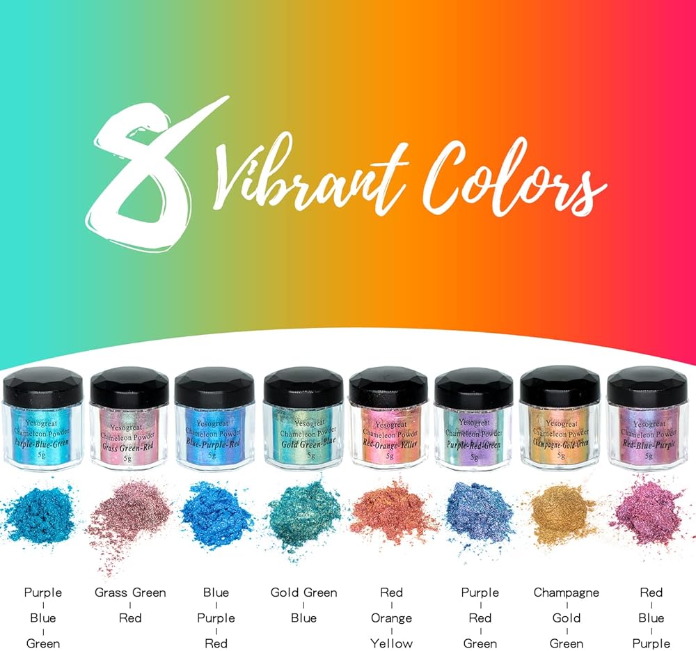 ✨【8 Color Chameleon Pigment Powder】: 8 jar popular color shifting mica powder, each 5g/0.17oz. (Note: The color changing pigment have a different volume because of powder's density, but each color is 0.17oz.)
