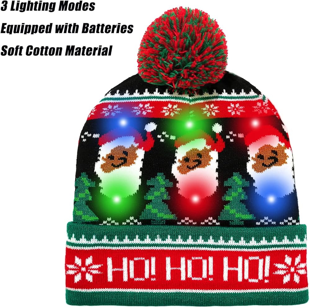 - Christmas hat has 6 lights (2 green, 2 red and 2 blue) and 3 lighting modes (fast flashing, slow flashing, constant light)