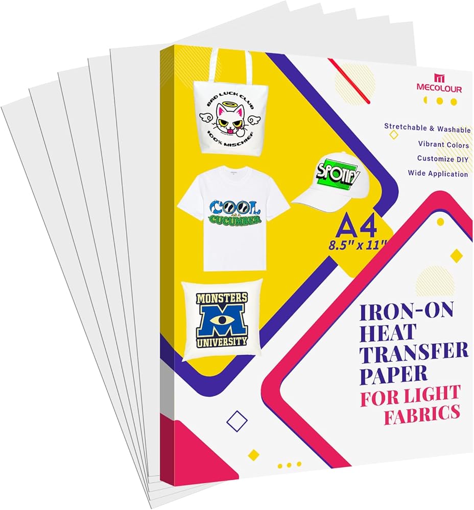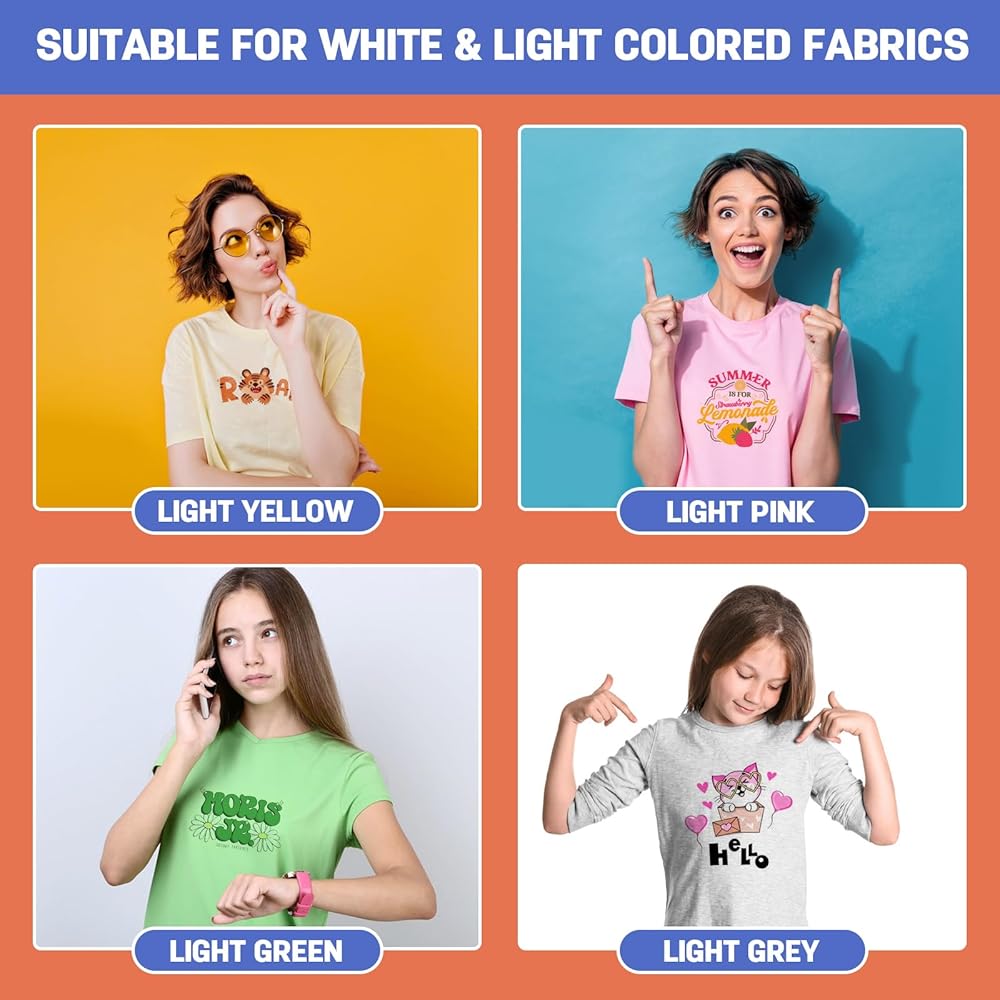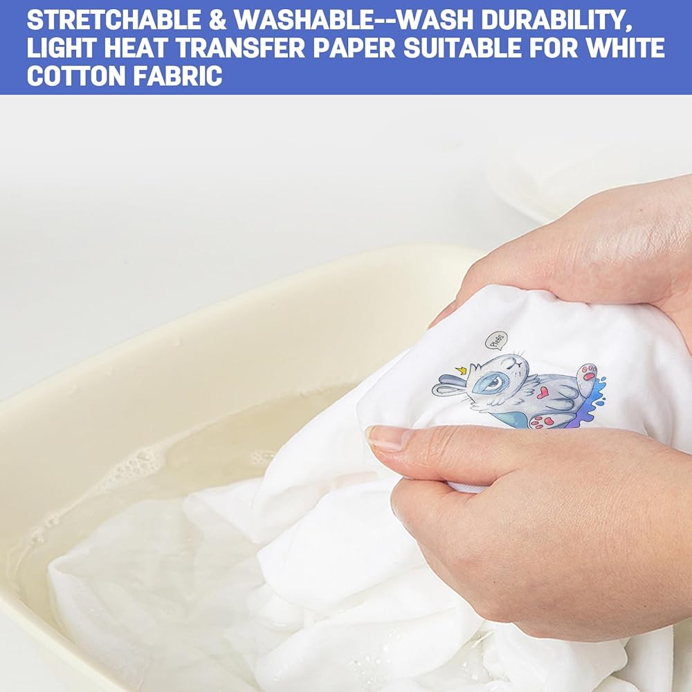 【Stretchable & Washable】Wash durability, Light heat transfer paper suitable for white cotton Fabric,Uniquely formulated heat transfer paper bonds with fabric, leaving it soft, stretchable, machine washable,without fading, cracking and peeling,Durable enough to withstand repeated washes and outdoor elements,You will definitely love it's excellent performance.