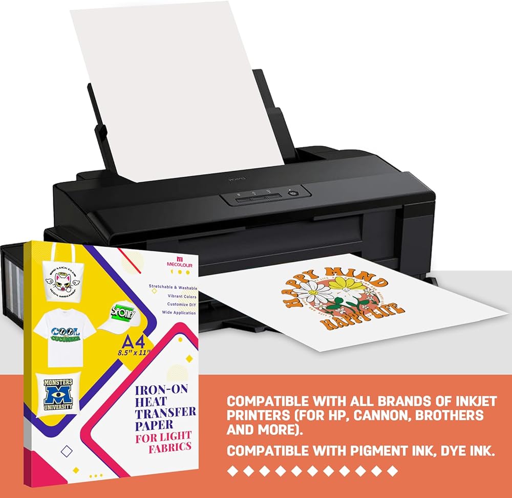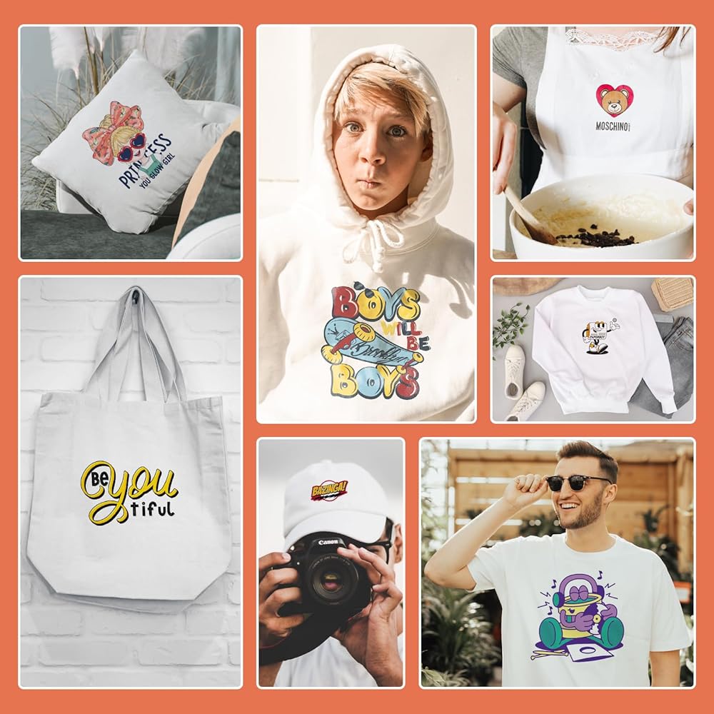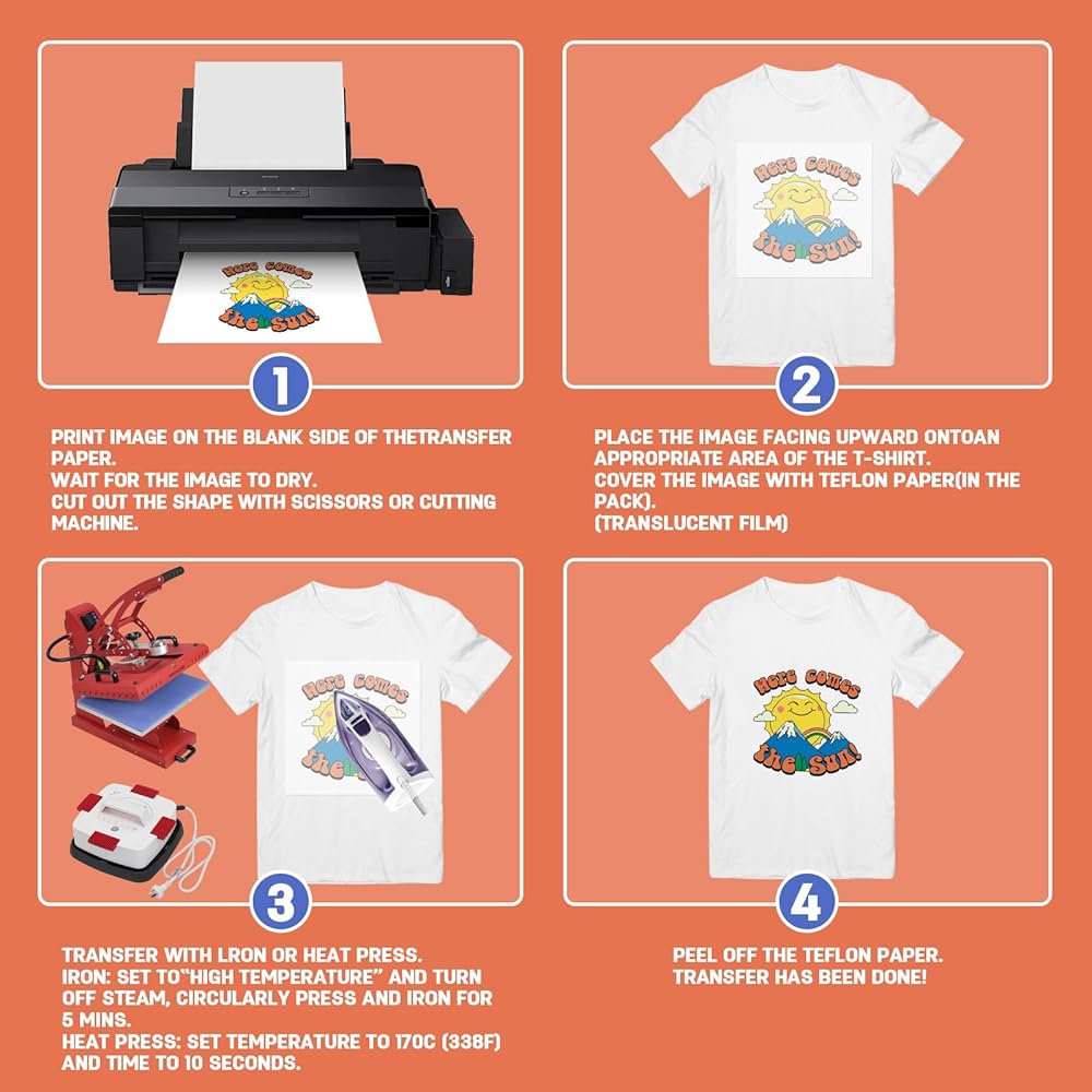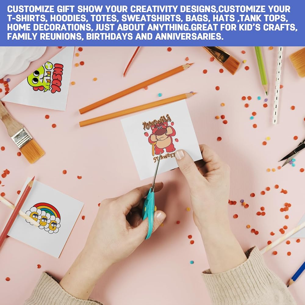 【Wide Application】Printable Heat Transfer Paper Compatible with all Inkjet Printers,Recommend pigment ink,Also works with Heat Press Machine,Cutters and Die Cutting Machines. Works with Most Home Irons.