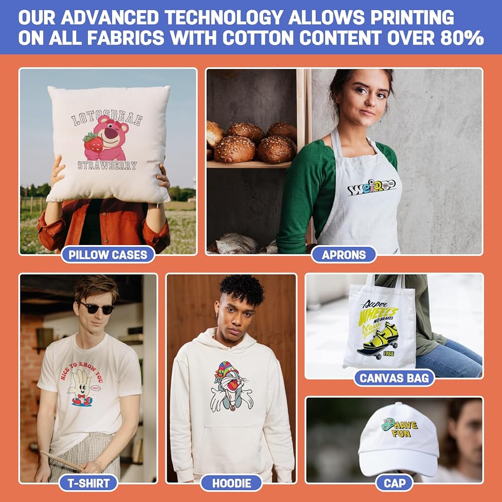 【Advanced Technology】8.5X11 Inches,for Light and White T-Shirts. Our advanced technology allows printing on all fabrics with cotton content over 80%,such as pillow cases, aprons, or any other cotton/polycotton fabrics.Iron recommended use:1400w or higher,iron for about 4-5 minutes.