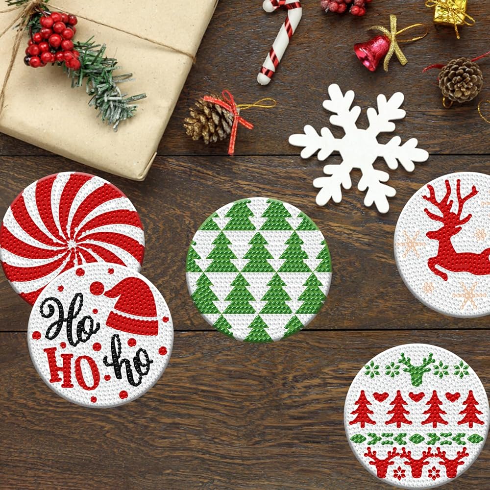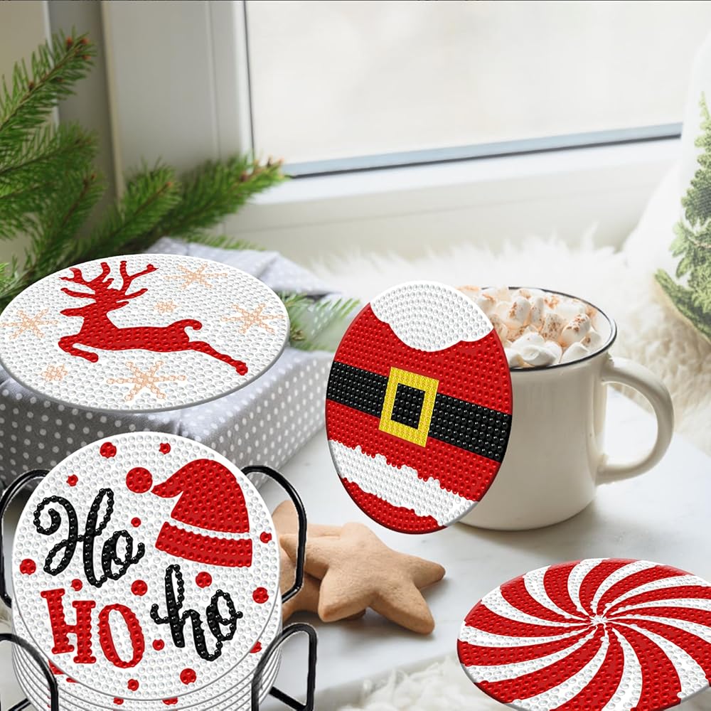 【High Quality Material】: This set of christmas diamond art coasters is made of thickened acrylic plastic, which is not easily worn, broken or deformed, ensuring long-term use. The cork base can be fixed on the back of the coaster to prevent it from slipping off. The finished diamond art coasters are coated with diamond paint sealer, which can keep its luster for a long time!