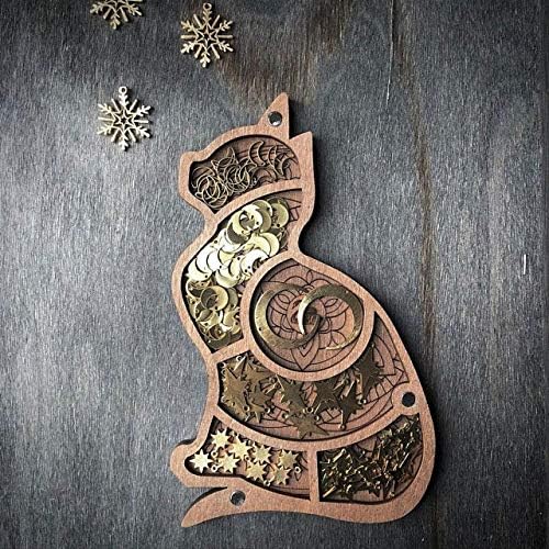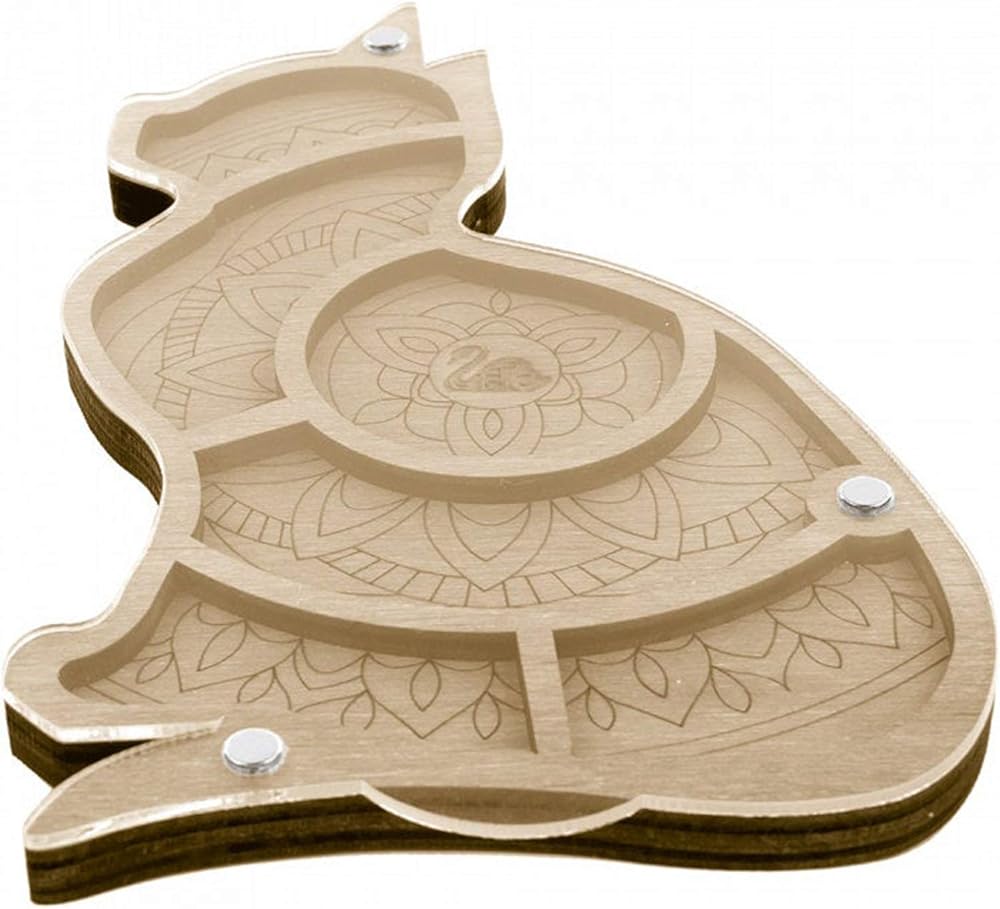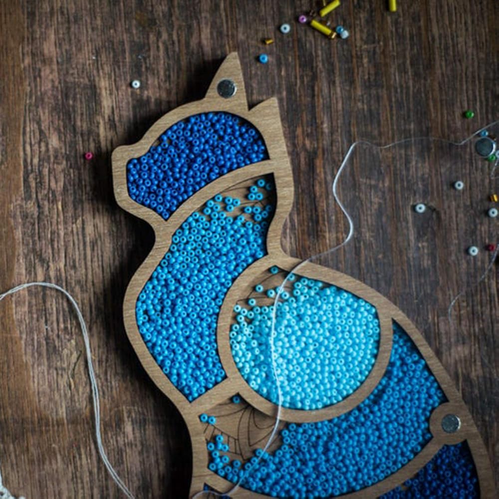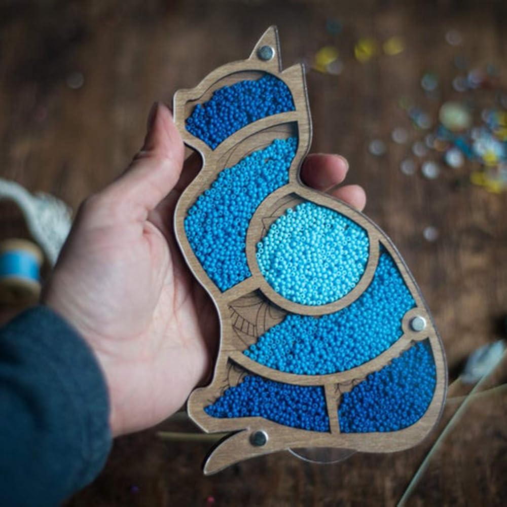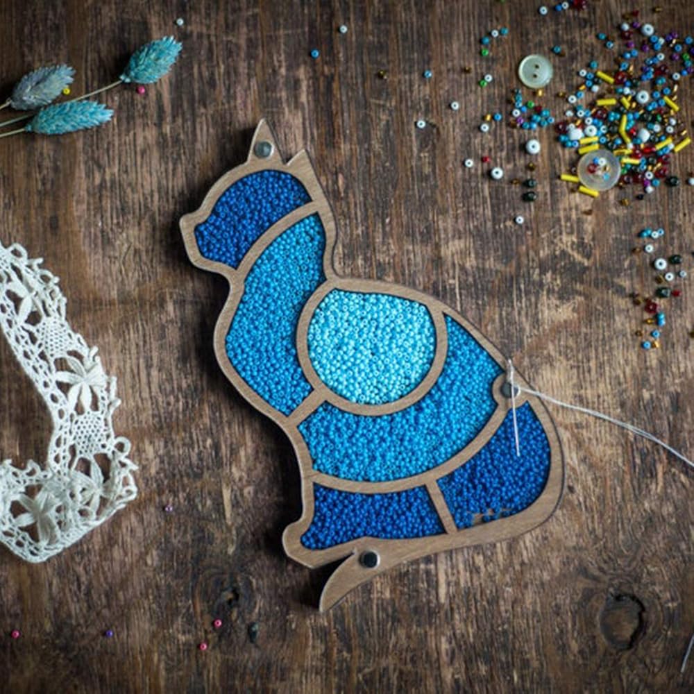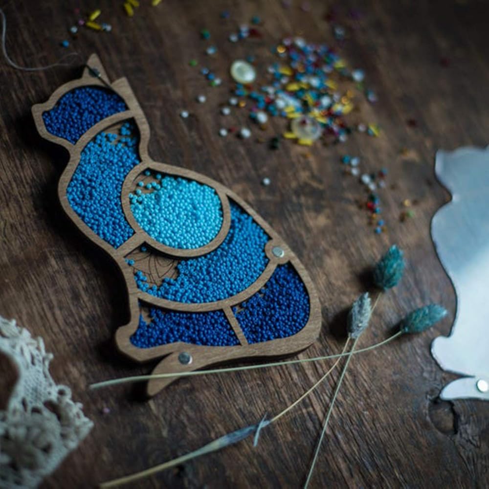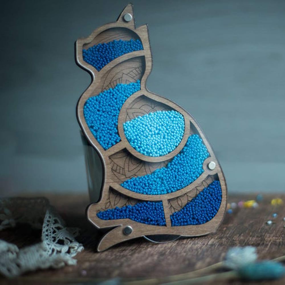 Wooden cat-shaped bead organizer with transparent cap and magnetic needle holder