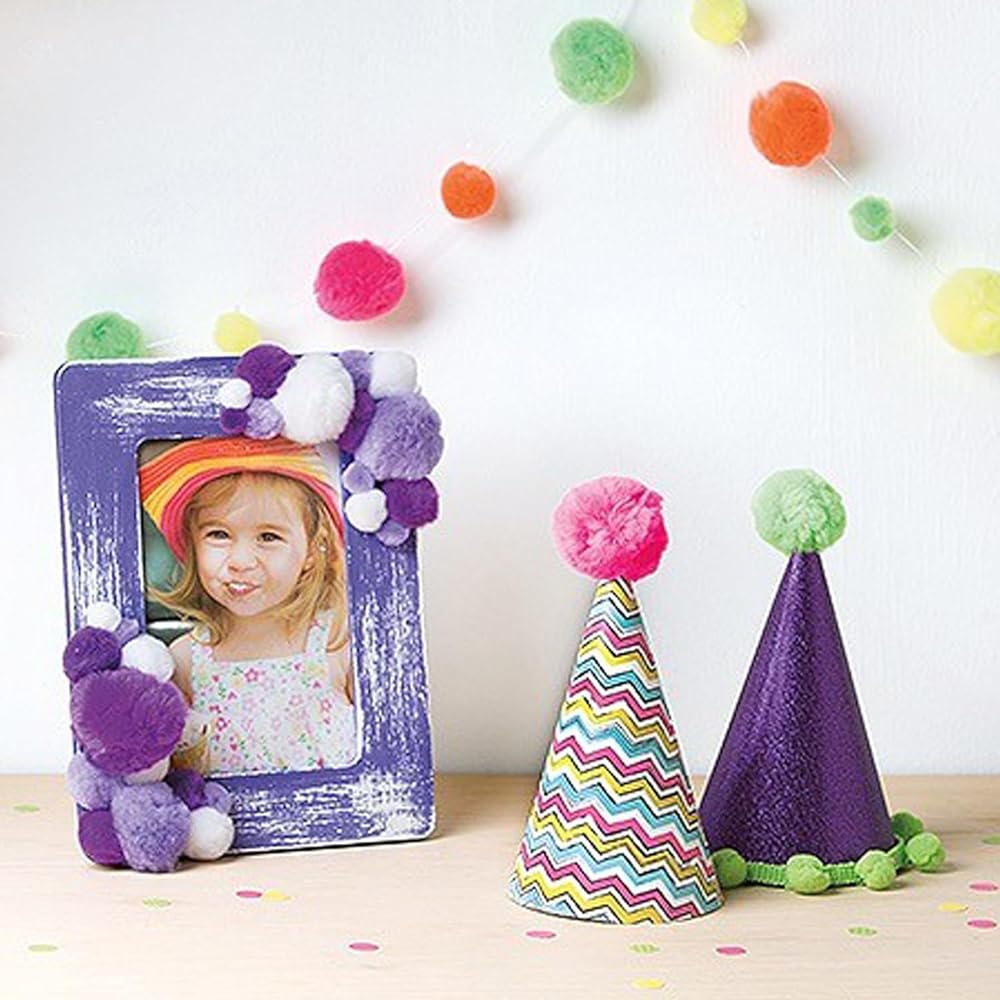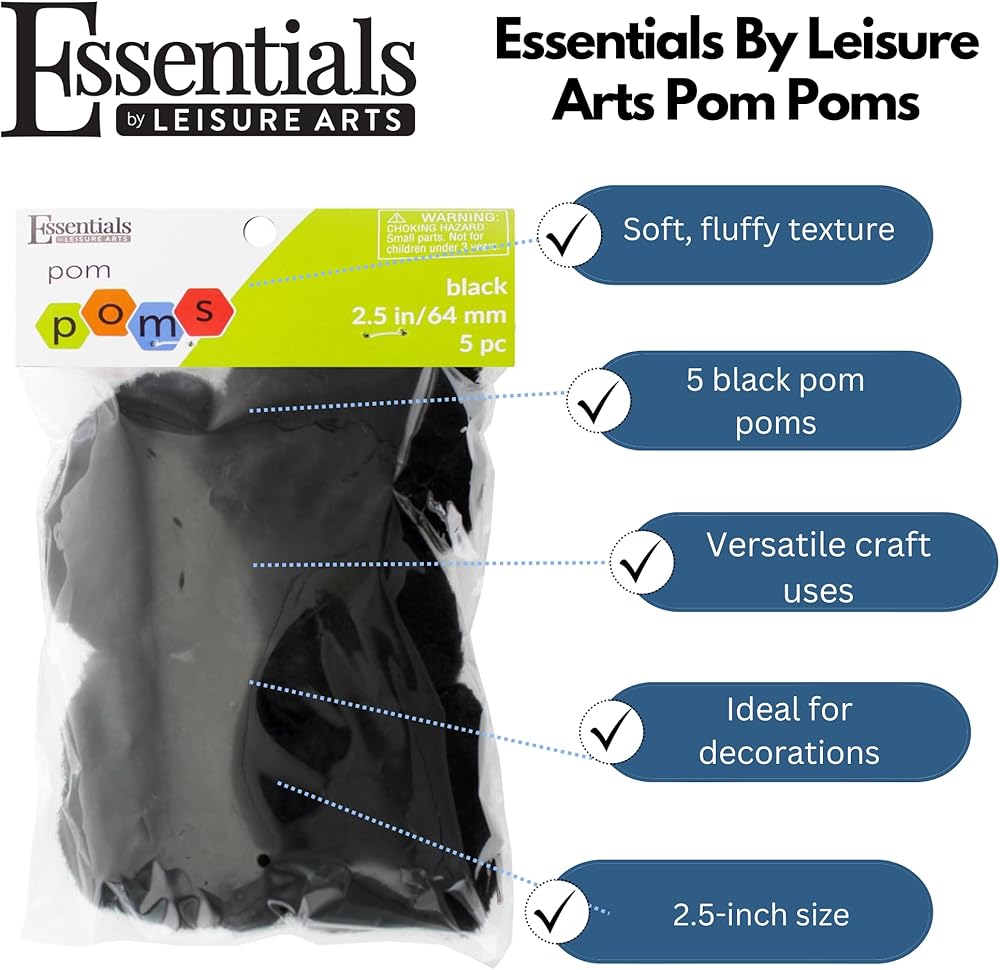 Essentials By Leisure Arts High Quality Pom Poms have so many craft uses. These 3" black pom pom balls come in a package of 4 pieces and can be used to make various crafts such as toys, garlands, necklaces, pendants, dress decorations, etc., as well as decorative accessories, baby album covers, and decorative paintings. Children can create art projects and release their imagination with these pompoms. They can be applied to create toy, garland, wreaths gifts, art projects, necklace, camp crafts, decoration, costumes, etc, your kids can create as much as they like! Making craft projects together with these pompoms, can further the affection between parents and children. With these colorful pompoms, you can not only satisfy children's interest and love for DIY, but also improve children's ability to recognize various colors, develop hands-on skills, imagination and creativity and exercise hand-eye coordination. For everyone's safety, we do not recommend these pom pom balls for very young children as they can pose a choking hazard. Be sure to monitor all children during use.