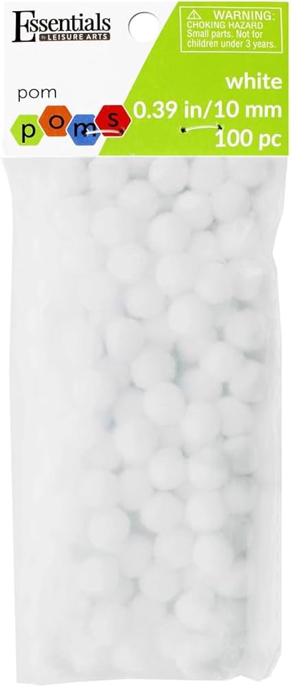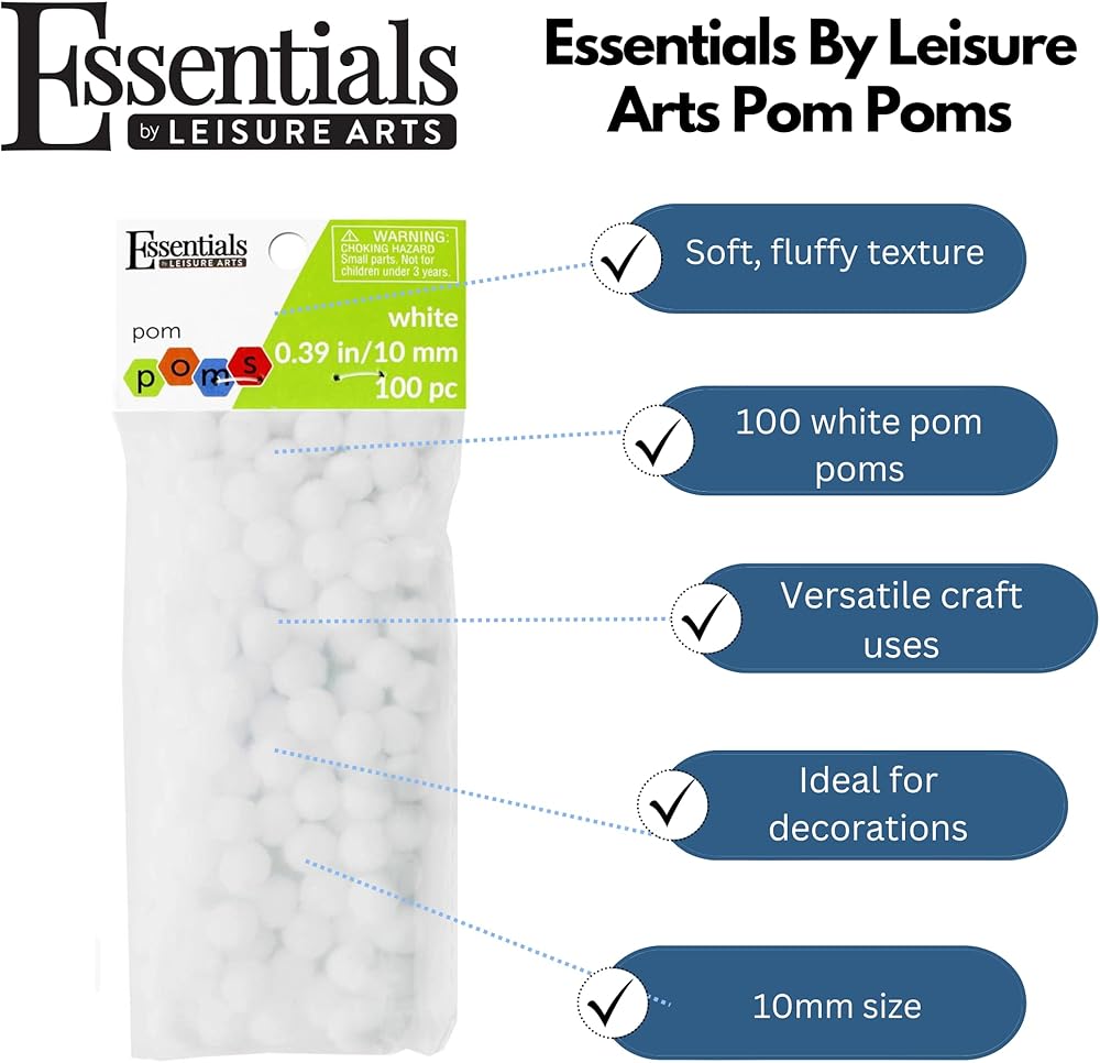 Essentials By Leisure Arts High Quality Pom Poms have so many craft uses. These 10mm white pom pom balls come in a package of 100 pieces and can be used to make various crafts such as toys, garlands, necklaces, pendants, dress decorations, etc., as well as decorative accessories, baby album covers, and decorative paintings. Children can create art projects and release their imagination with these pompoms. They can be applied to create toy, garland, wreaths gifts, art projects, necklace, camp crafts, decoration, costumes, etc, your kids can create as much as they like! Making craft projects together with these pompoms, can further the affection between parents and children. With these colorful pompoms, you can not only satisfy children's interest and love for DIY, but also improve children's ability to recognize various colors, develop hands-on skills, imagination and creativity and exercise hand-eye coordination. For everyone's safety, we do not recommend these pom pom balls for very young children as they can pose a choking hazard. Be sure to monitor all children during use.