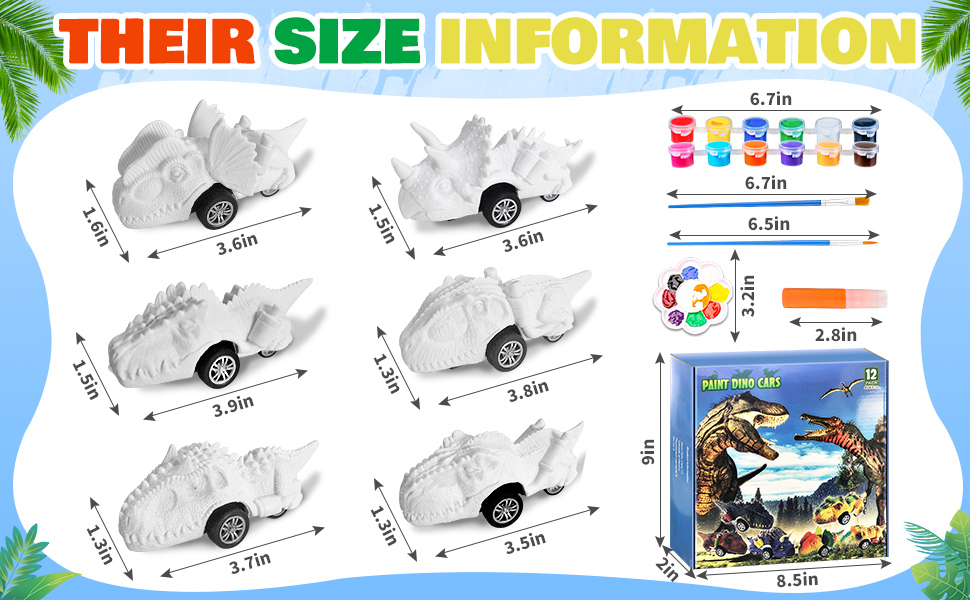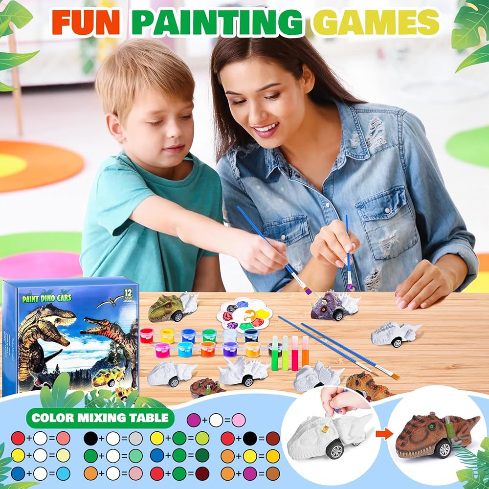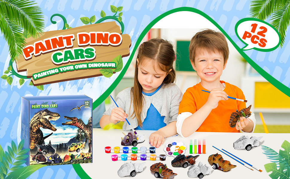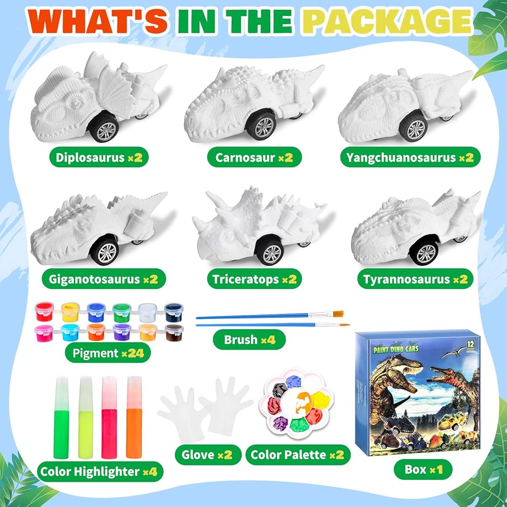 🦕2 in 1 DIY Dinosaurs & Pull Back Cars Toys: Our art kit includes 12 paintable Dino cars with 6 different kinds.4 highlighter pens let the painted Dino glow in the dark,2 pair of gloves,2 set of paint kit (total 4 brushes, 24 paint pots).Our toys are perfect combo for dinosaurs and pull back car, kiddo can paint Dinos the way he wants.Def recommend 2 in 1 dinosaurs painting kits &pull back cars toys for kids!
