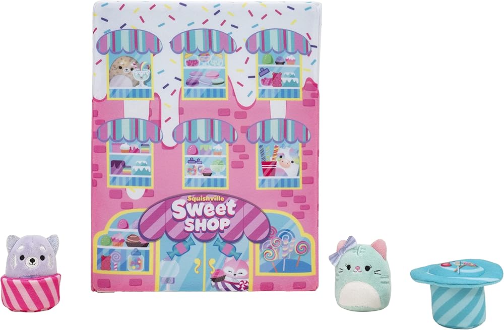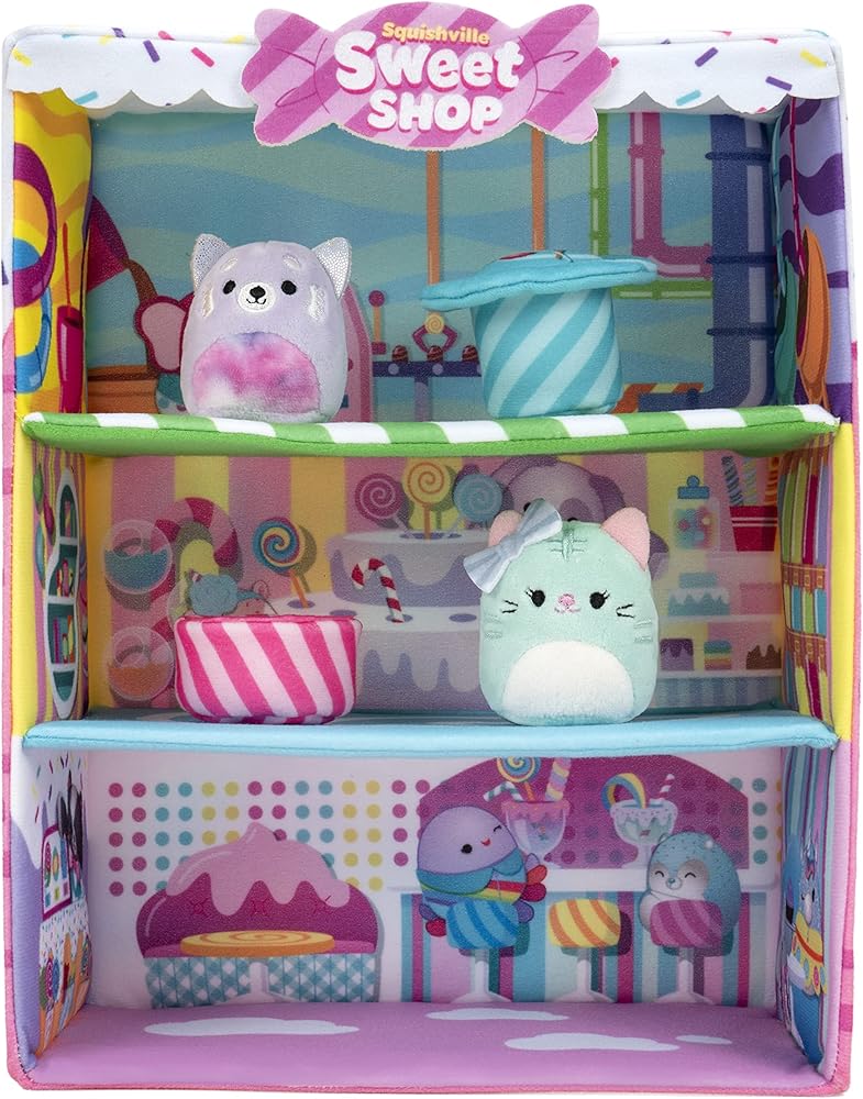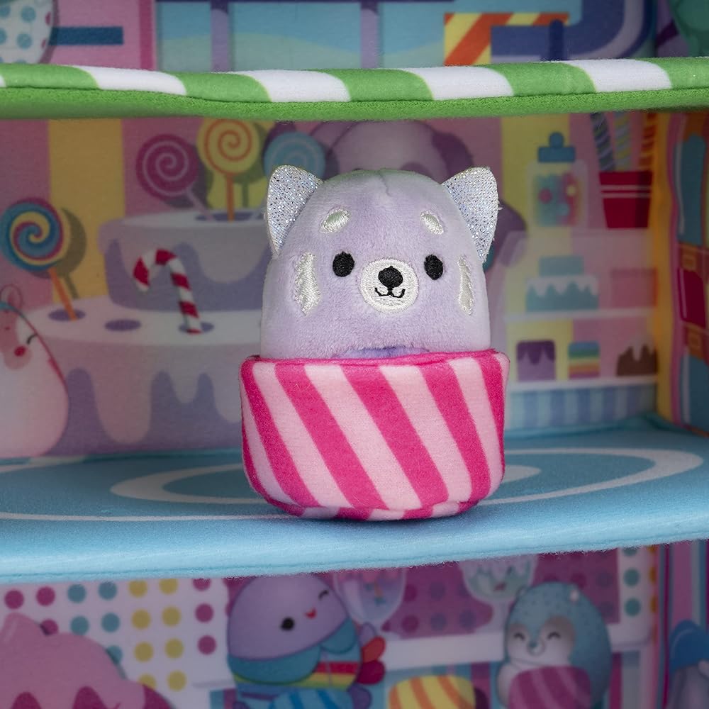 Mix a pint of plush with that sugar rush at the Squishville Sweet Shop! Featuring three floors of candy-coated galore and two sweet Squishmallows, this powdery playset is filled with an explosion of flavors. Join Priya the Lavender Panda and Tres'zure the Teal Cat at the ice cream counter for some shakes and cake. Then, check out the conveyor belt to see how the chocolate pops get filled. Finally, ”treacle” down to the Swirly Shop and sit down at a bistro table and chair set to enjoy a full selection of scrummy confections. Bring home the Sweet Shop to build out your ultimate world in Squishville!