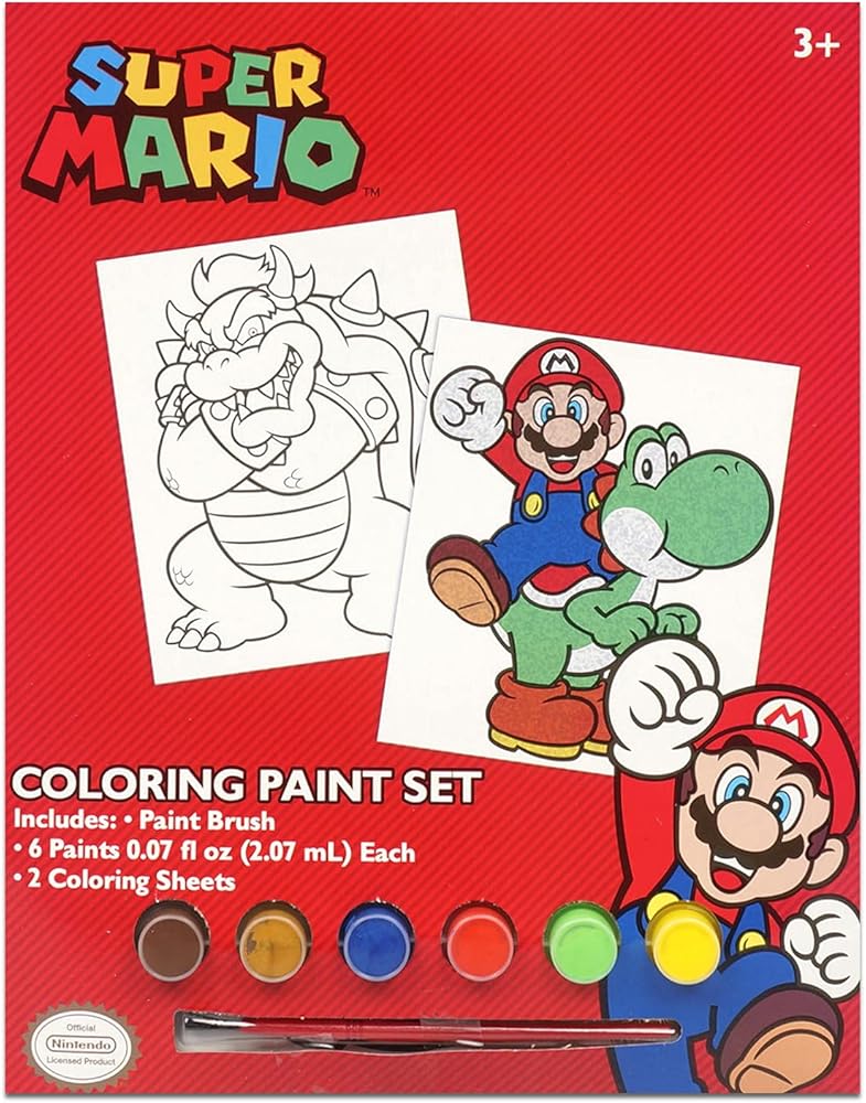 Nintendo Mario Paint Posters Set - 4 Pc Bundle with Super Mario Painting Activity Book, 600+ Stickers, and More | Super Mario Coloring and Activities for Toddlers, Kids. This Mario art painting set includes 1 Mario paint poster activity book with 6 colors, 1 brush, and 2 coloring sheets, as well as 1 Mario sticker book with over 300 stickers inside. This Mario activity bundle for girls and boys is perfect as Mario birthday party supplies, party favors, decorations, motivational stickers, reward stickers or just for fun for Mario fans of all ages! The Super Mario arts and crafts bundle is sure to bring hours of enjoyment and entertainment to girls and boys of all ages. Featuring favorite characters such as Mario, Luigi, Yoshi, and Bowser. Officially licensed Nintendo Super Mario arts and crafts games and activities for boys and girls. The Mario art activity set also comes with Rex-Man stickers and a Beach Kids superhero door hanger.
