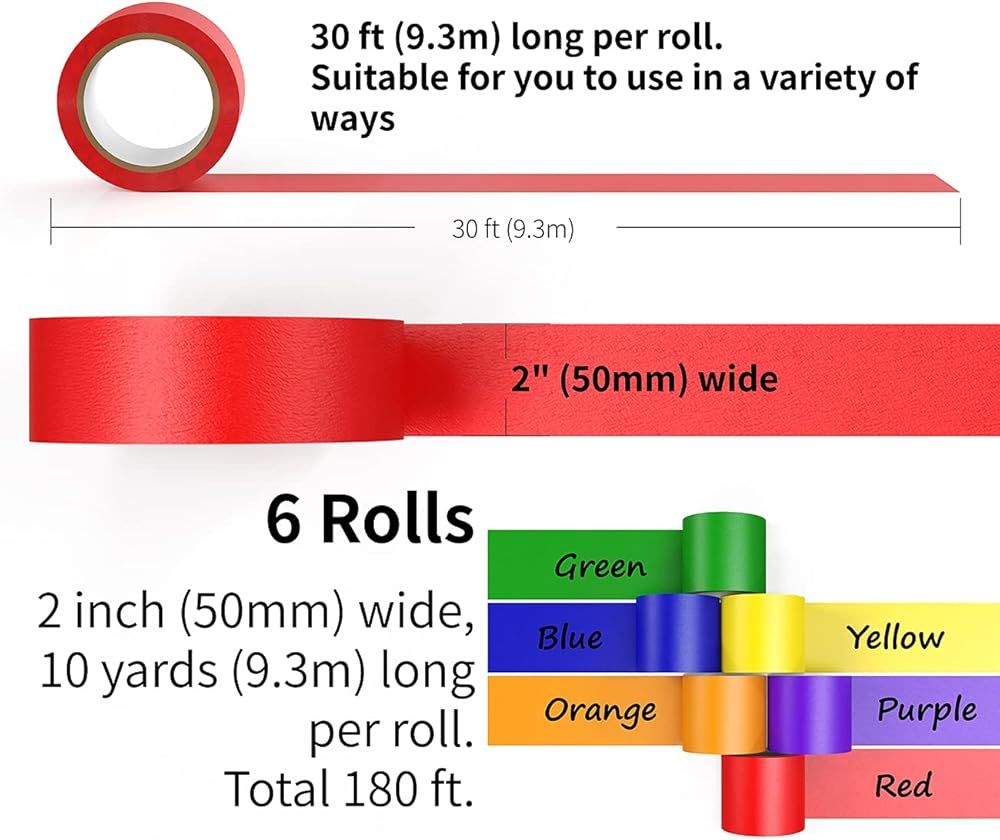 Dimensions & Colors - 6 Rolls, total 162 ft, each roll is 2 inch (50mm) wide, 9 yards (8.3m) long. 6 different colors. Red, Orange, Yellow, Green, Blue, Purple.