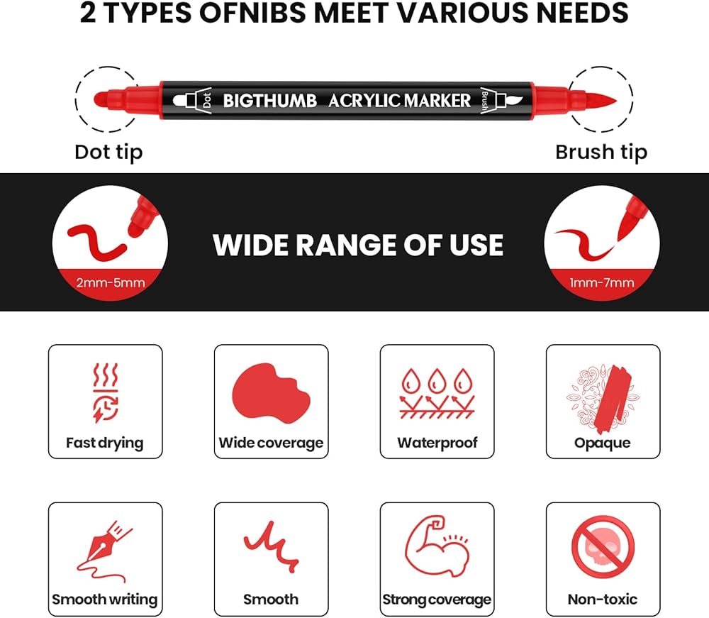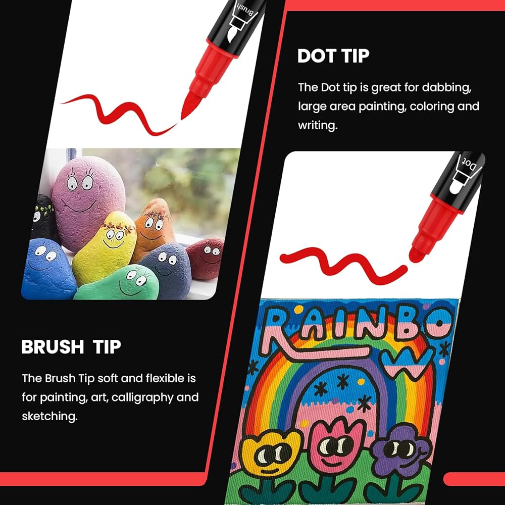 【Dual Tip Acrylic Paint Pens Markers】Each acrylic marker come with a 1-7mm Brush nib and a 2-5mm Dot nib. Dual tip design meets different coloring needs. Brush nib is for fine drawing, sketching and coloring, while the Dot nib is for dabbing, painting, coloring and writing.