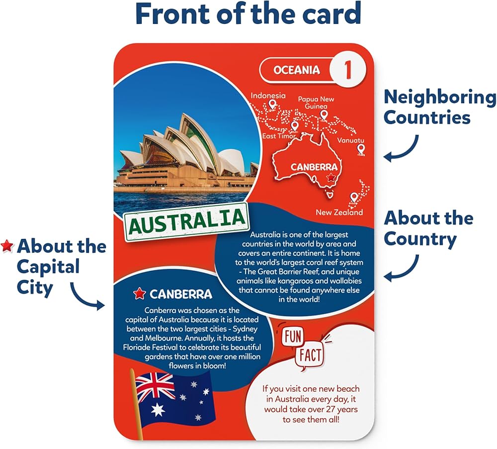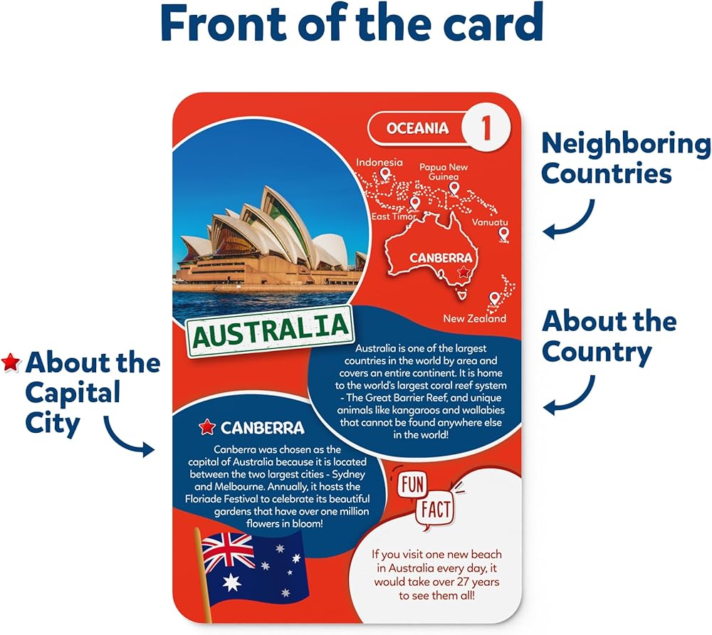 250+ FUN FACTS: The state cards offer an entertaining and educational experience with fun facts about the States of America, including their capitals, landmarks, and interesting cultural and historical facts. This can stimulate a child's curiosity about their country and its diversity.