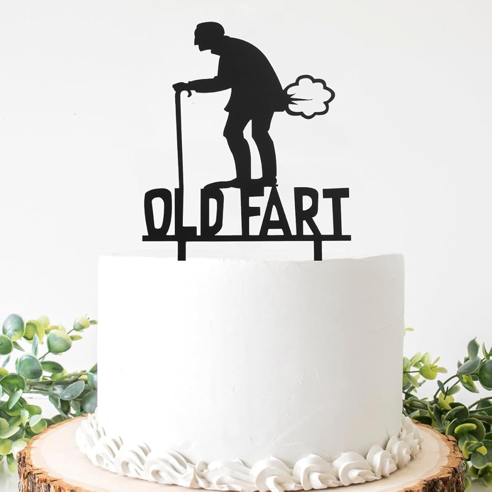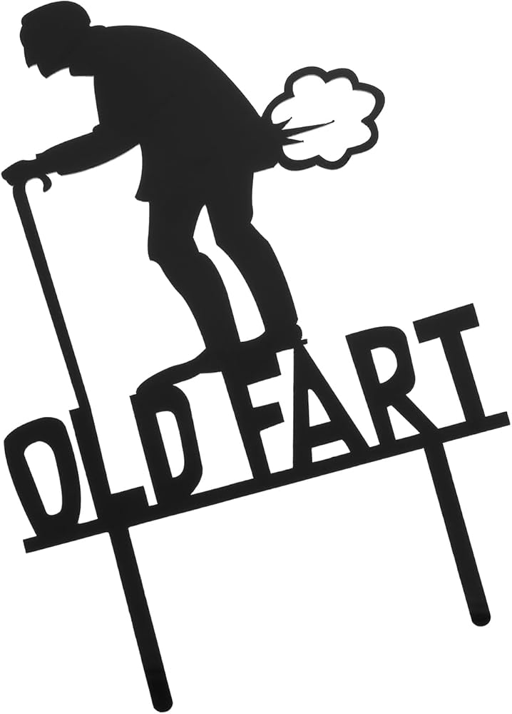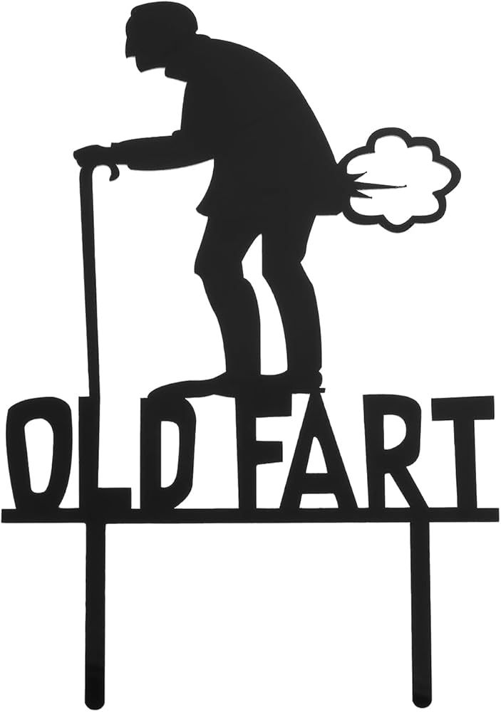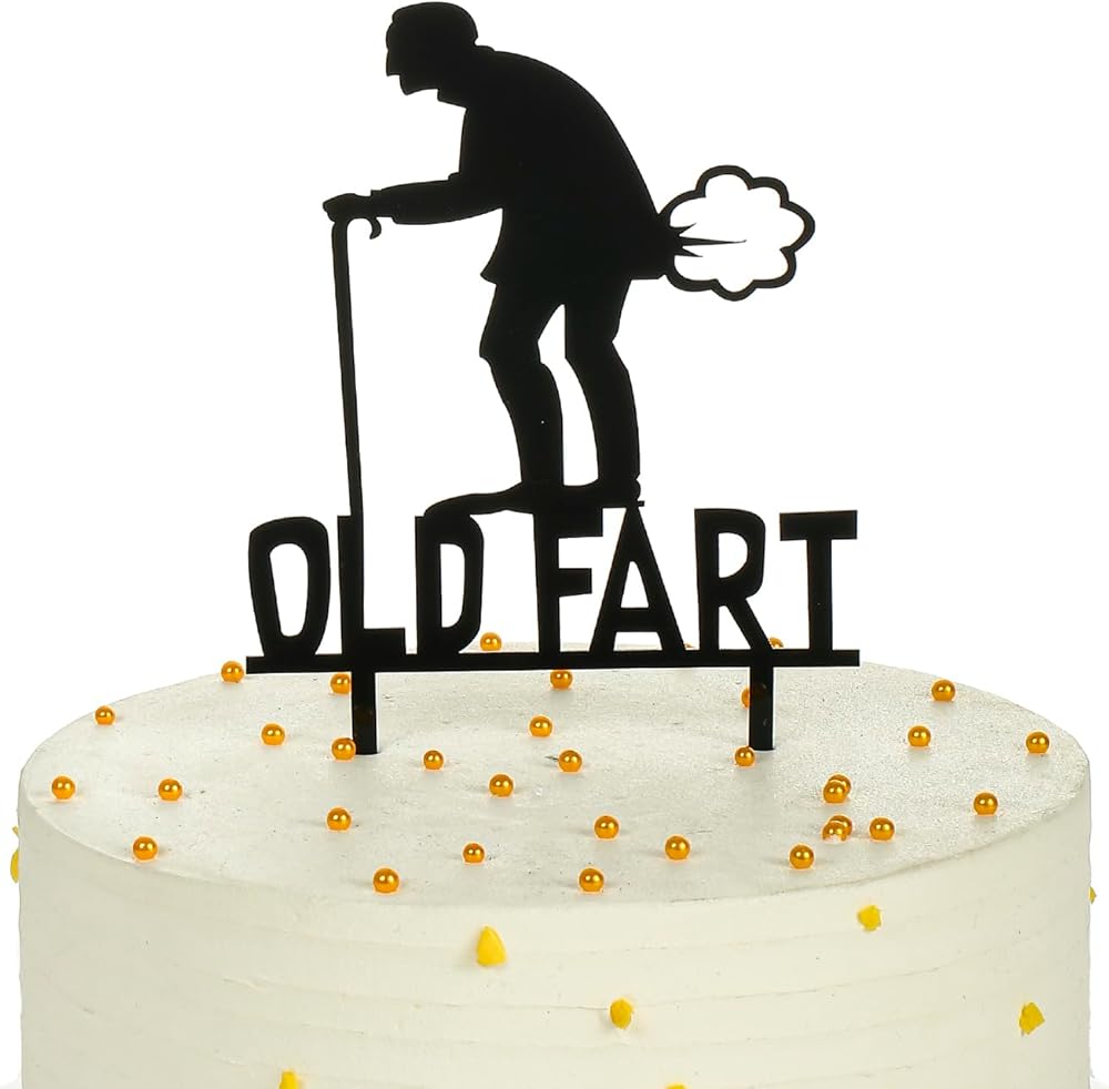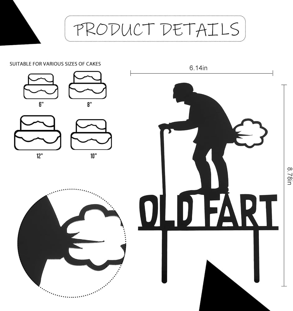 1.【What You Will Get】A humorous black acrylic cake decoration"Old Fart" cake topper, which can bring more fun to your party!This is a product Specially designed for the old,Crafted with great attention to detail, this cake topper features a The elderly man leaned on a cane and humorously farted while walking,This funny cake topper,It's going to a perfect funny addition .
