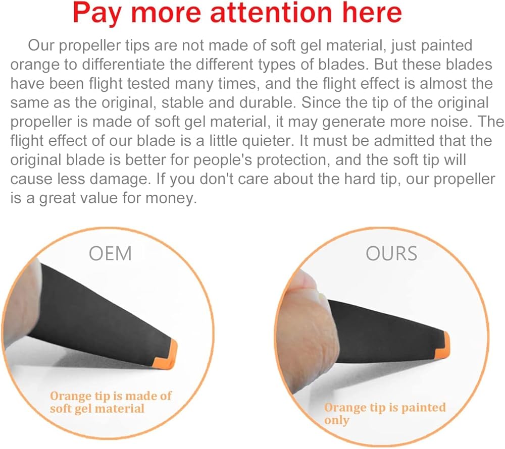 ✅LOW NOISE DESIGN: Propellers specially made for DJI Mini 3 Pro produce less noise Because the tip of the original propeller is made of flexible rubber, the propeller may have obvious noise. However, the tip of our propeller is painted orange, and its flying effect is much more quiet. and have undergone precise dynamic balancing tests, The flying effects are nearly the same as those of the original ones, and you can save more costs.