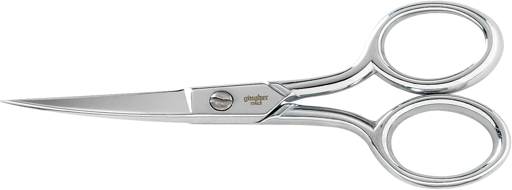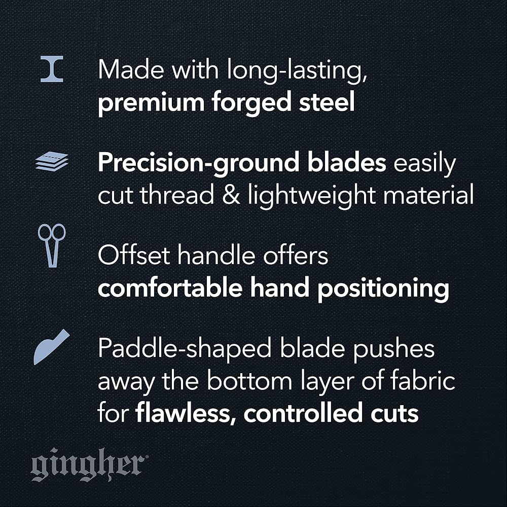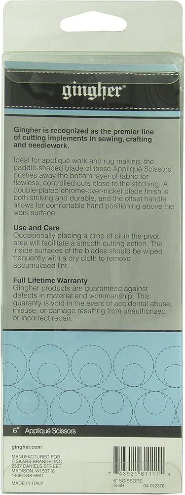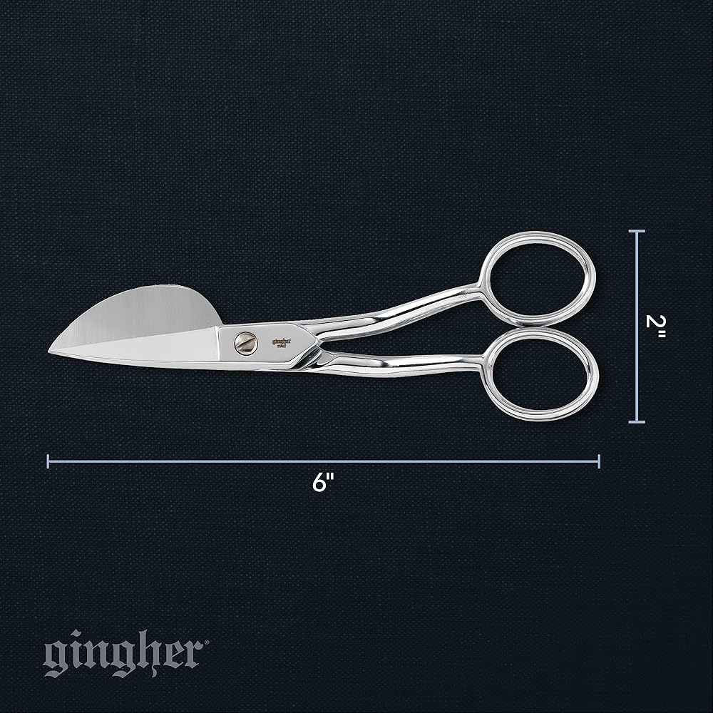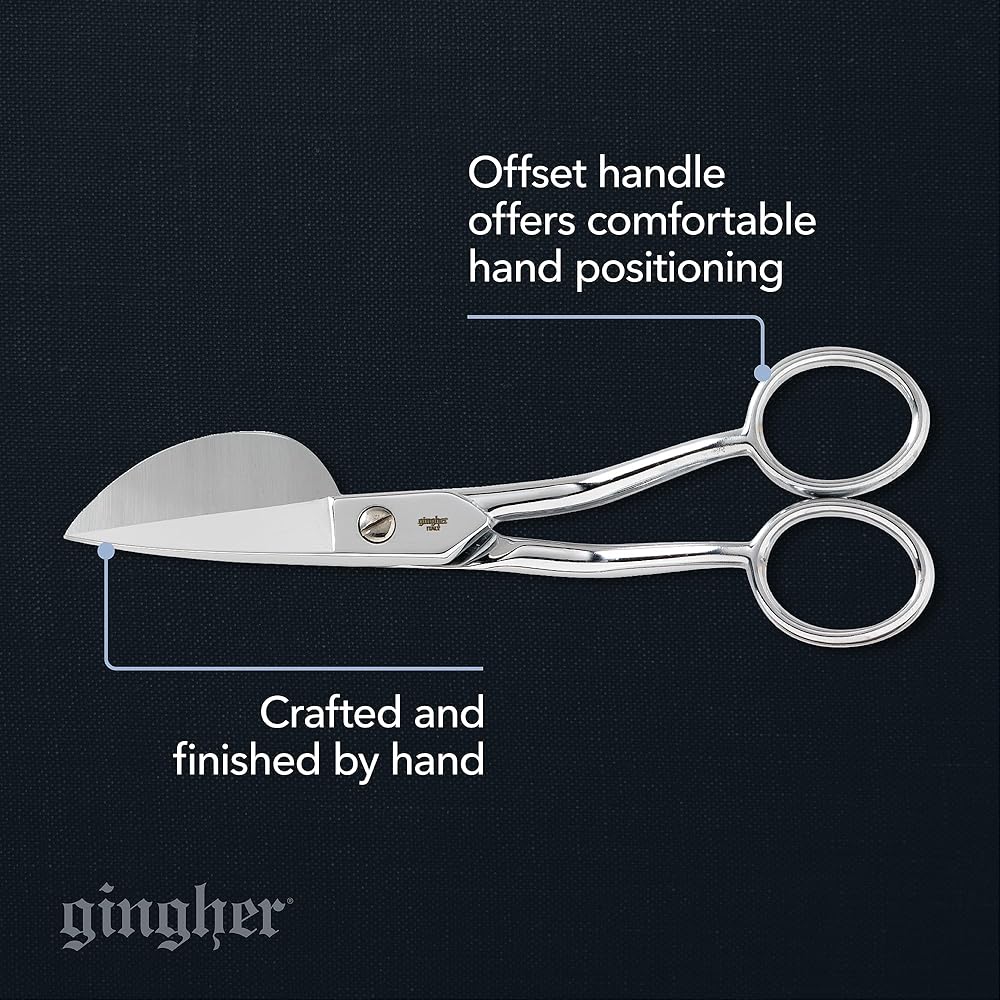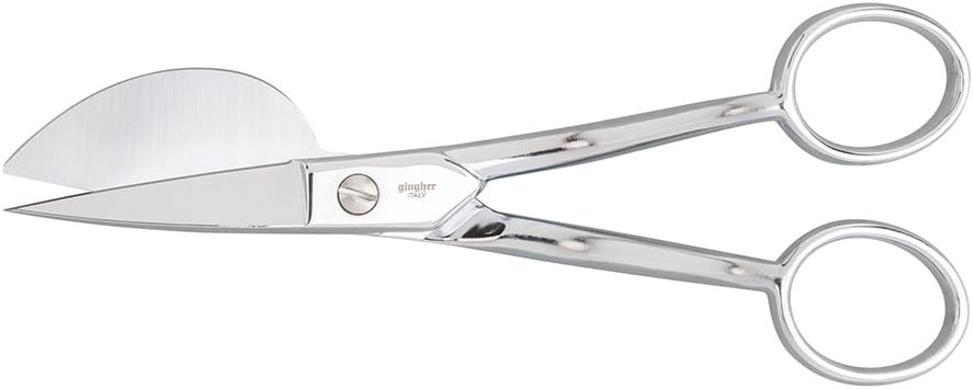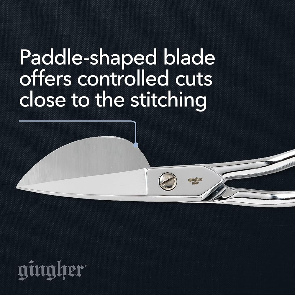 Ideal for applique work and rug making. The paddle-shaped blade pushes away the bottom layer of fabric for flawless controlled, cuts close the stitching. The offset handle allows for a comfortable hand position above the work surface. A double-plated chrome finish over nickel is both handsome and durable. Scissors come in a beautiful tin storage case with a burgundy mold fitted to the scissors' profile.
