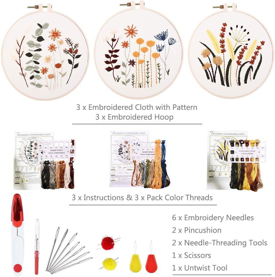 【ESSENTIAL DIY HAND EMBROIDERY STARTER KIT】Embroidery Starter Kitis an unique and Beautiful craft that can be applied to wide application. Itcontains 24 accessories including 3 x embroidery hoop, 3 x embroidered cloth with pattern and instructions, 3 x pack color threads,6 x embroidery needles,2 x pincushion,2 x needle-threading tools,1 x scissors,1 x untwist Tool,everything you want in a embroidery kit.