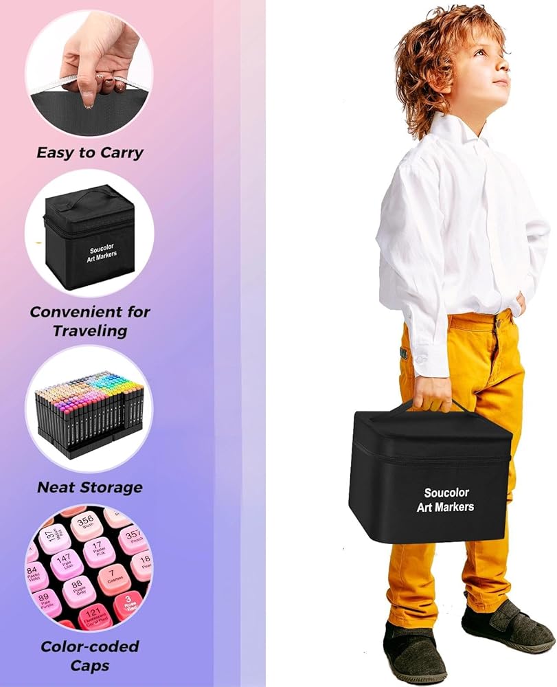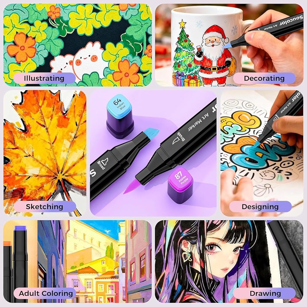 Soucolor Alcohol Markers Set, 100 Colors Dual Tip Brush Art Alcohol Markers, School Office Teacher Supplies for Kids and Adults Coloring Drawing Sketching Book Painting Card Making Illustration