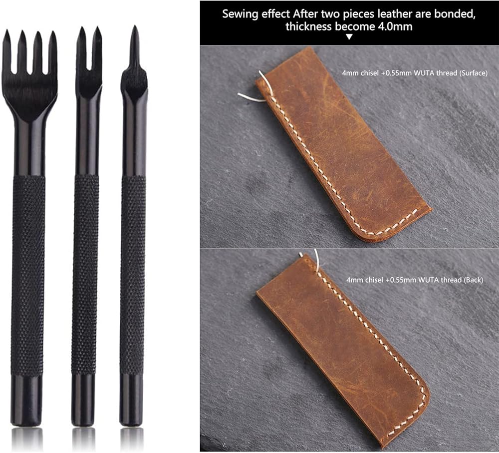 4 mm Stitching Chisel: Leather stitching kit includes 3pcs 4 mm stitching prong punch (1 Prong/ 2 Prong/ 4 Prong), made of white steel with well polish, the leather stitching punch is durable and smooth, comfortable to hold and helpful to punch quickly and effortlessly with sharp rhombus tooth.