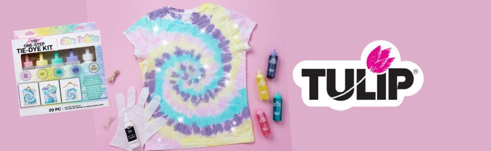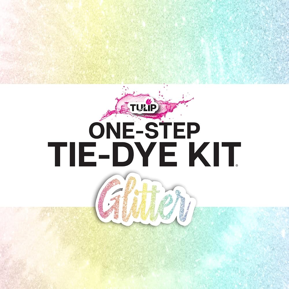 Make your tie-dye projects sparkle & shine with the Tulip® Glitter One-Step Tie-Dye Kit®! This unique, easy-to-use tie-dye kit comes with the tools and special instructions you need for your colorful glitter tie-dye experience. Stocked with 4 bottles of vibrant coordinating One-Step Dyes (blush, lemon, mint and lavender) and a special Glitter Mixer to add to your dyes, plus rubber bands, gloves, and a glitter tie-dye instruction & inspiration guide. This kit is ready to add sparkling color to your wardrobe with shimmering designs you can mix & match with each other and your other tie-dye creations. Makes a great gift too!