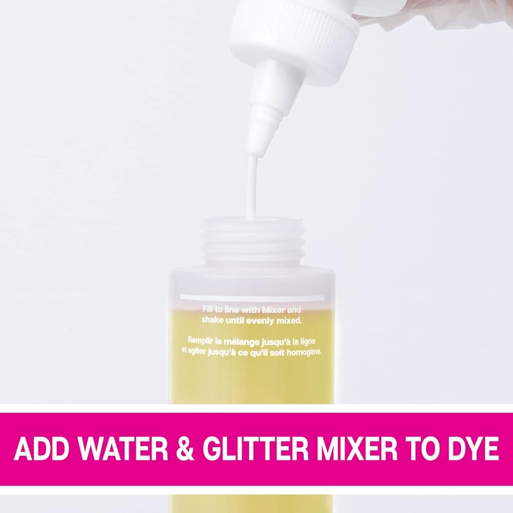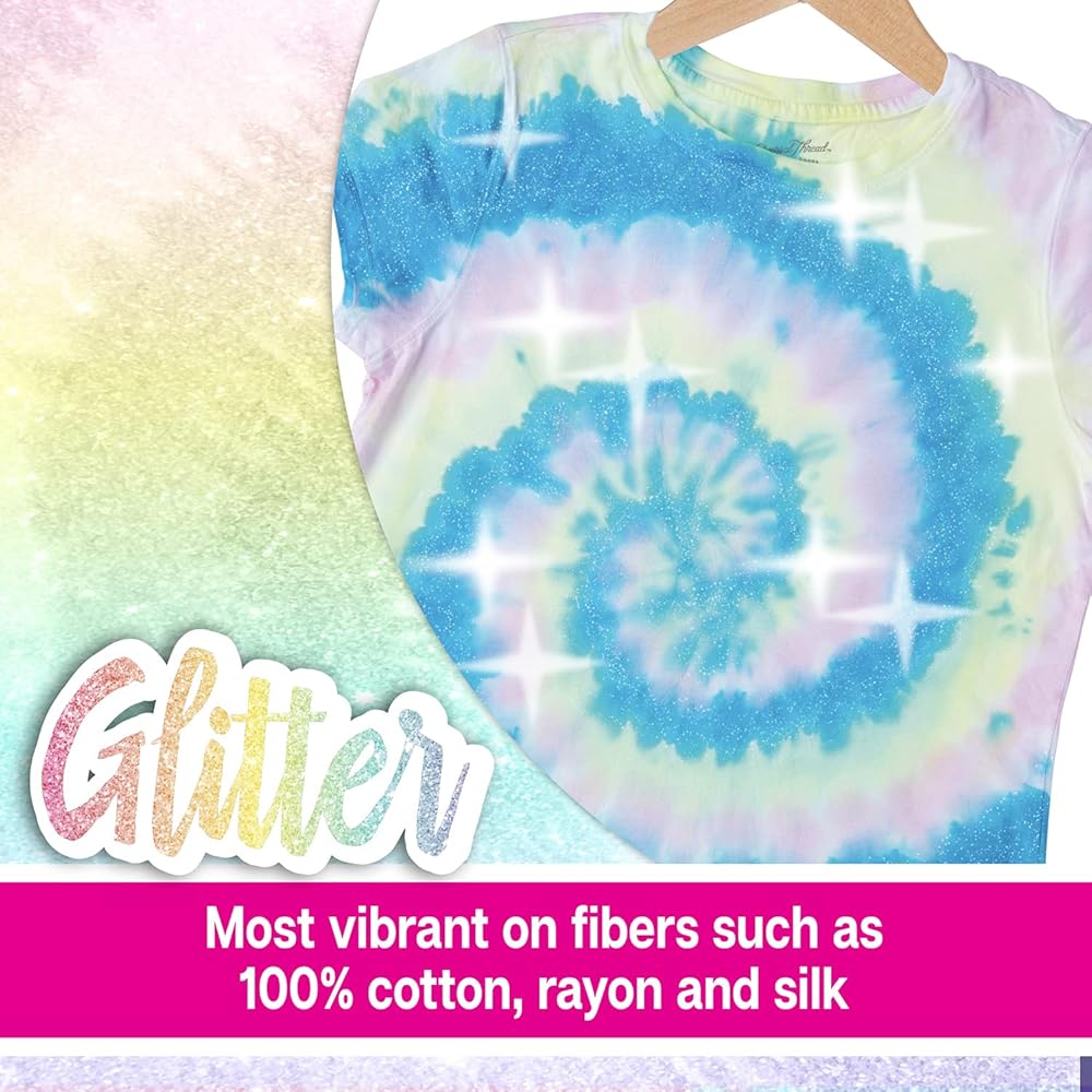 A TOTALLY UNIQUE WAY TO TIE DYE: This fun tie-dye kit gives you the dyes, glitter mixer, and special instructions you need to easily create sparkling tie-dye designs for A WHOLE NEW WAY TO TIE DYE. Kit features 4 bottles of One-Step Dye, 1 bottle of Glitter Mixer to add to your dyes, 10 rubber bands, and 4 plastic gloves (2 pairs).