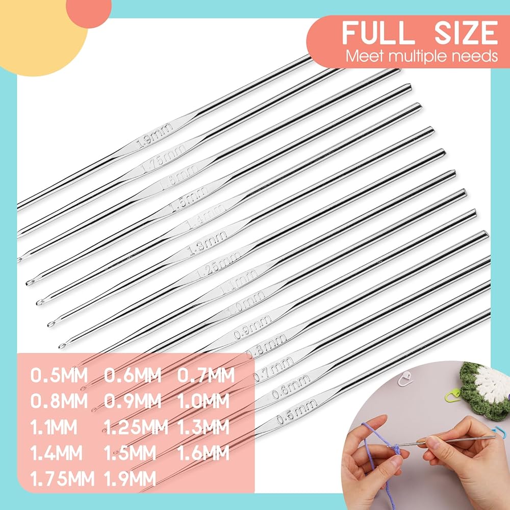 14 Sizes of Iron Crochet Hooks -- The crochet hook set includes 14 different sizes of crochet hooks, and each crochet hook is clearly marked with the size, which is easy to distinguish. The crochet hook sizes are: 0.5, 0.6, 0.7, 0.8, 0.9, 1.0, 1.1, 1.25, 1.3, 1.4, 1.5, 1.6, 1.75, 1.9 mm.