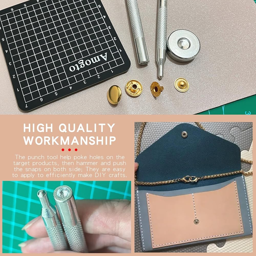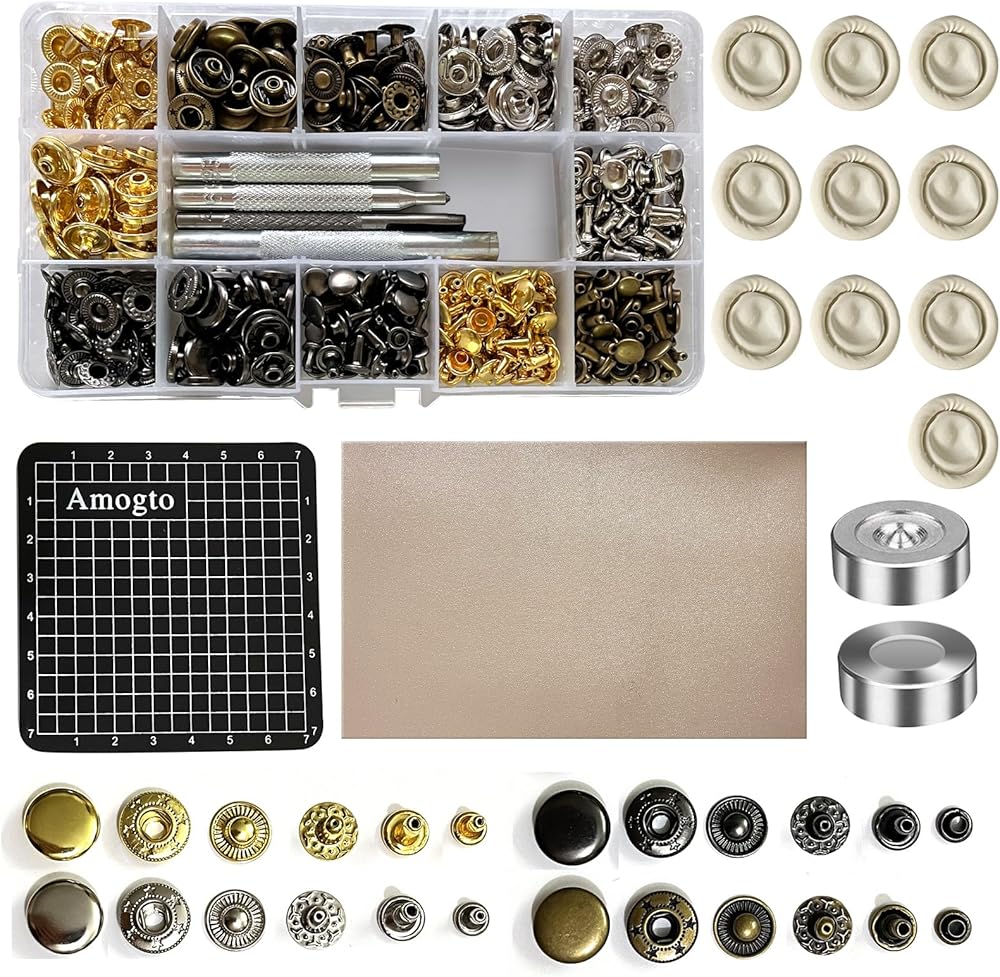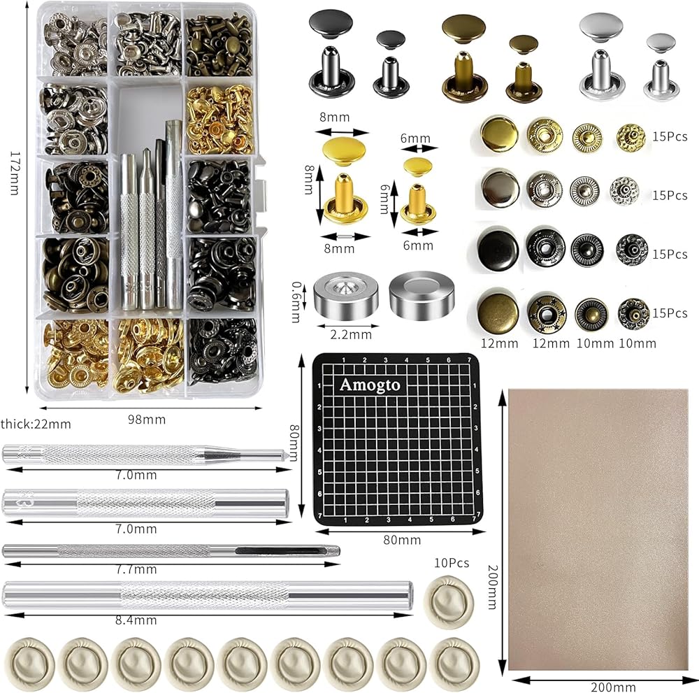 197 pieces set, 4 colors - gunmetal + silver + gold + bronze, 15 sets each of 4 colors of 12.5mm quad buckle, 15 sets each of 4 colors of 6*6 8*8 double-sided rivet buckle. Tools 5 sets of finger covers * 10 practice cloth leather * 1 leather ruler * 1.