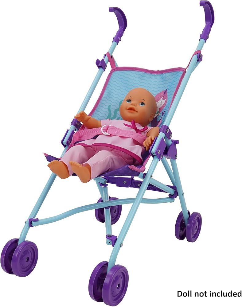 509 Mermaid Doll Umbrella Stroller made with Steel tube frame, easy to fold for storage and/or travel. The stroller seat has an adjustable seat belt to keep your favorite doll or stuffed animal safe and secure. The stroller's fun bright fabric is a durable polyester which can be hand washed. The stroller can be easily folded for storage. This 509 stroller also includes a safety lock system that prevents a sudden or unexpected collapse, both side safety latches have to be lifted in order to fold for storage or travel. For doll up to 24" (60cm). Kids will love taking their dolls and stuffed animals for a stroll. **Doll not included**.