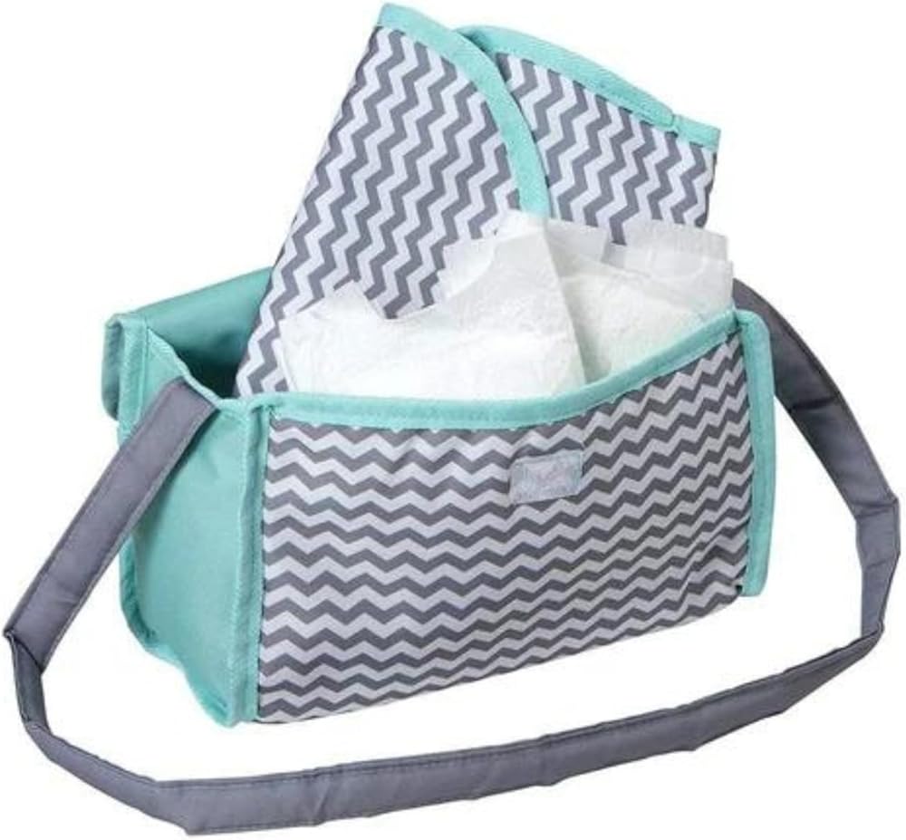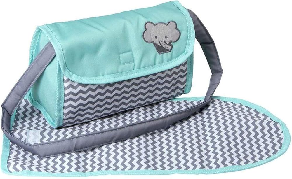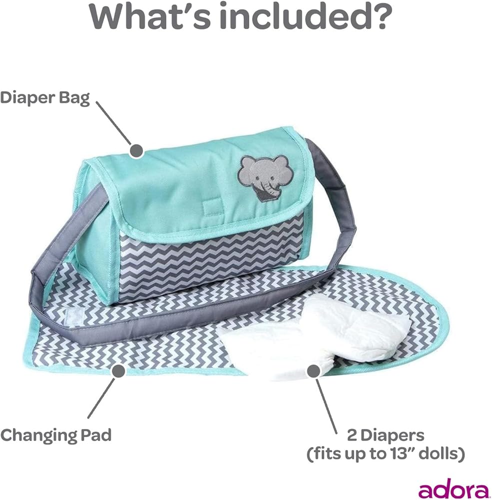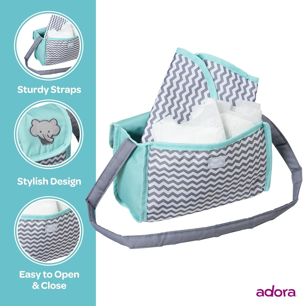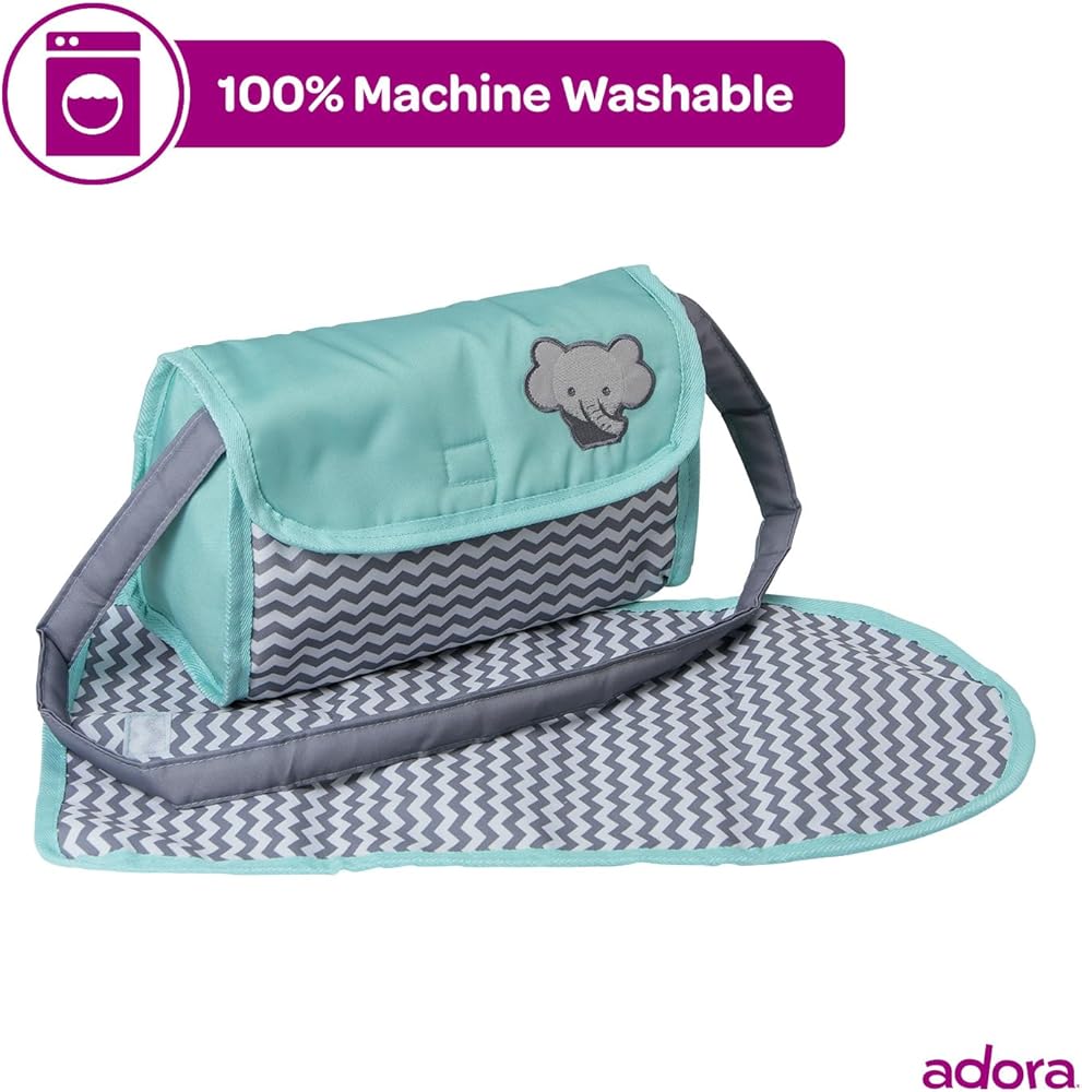 Introducing Adora's Zig Zag Diaper Bag – the ultimate accessory for little parents on-the-go! This gender-neutral bag boasts a stylish zig zag print in mint, white, and gray, complete with an embroidered elephant face. Equipped with a Velcro flap for easy access, a sturdy strap for portability, and a matching changing mat, this bag is perfect for 13-inch baby dolls. Fuel hours of interactive nurturing and imaginative play with this essential accessory, encouraging responsibility and creativity in every adventure.