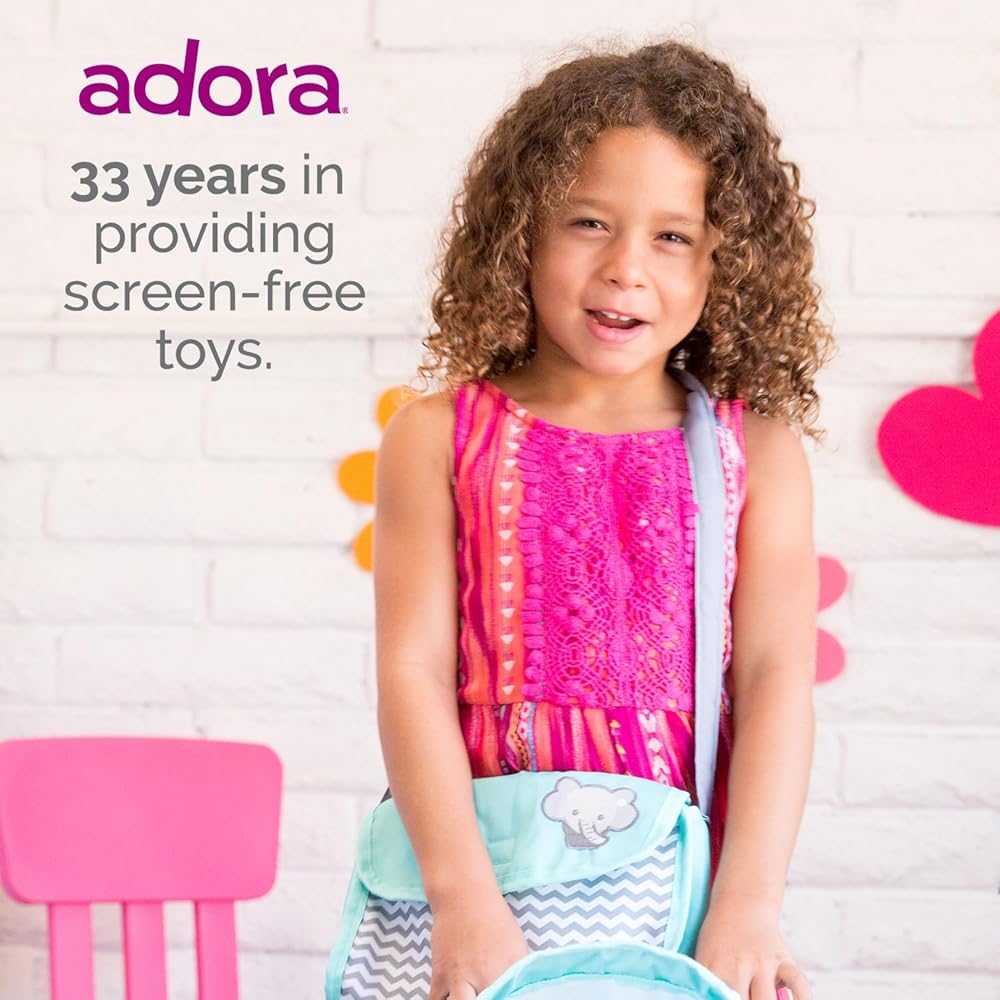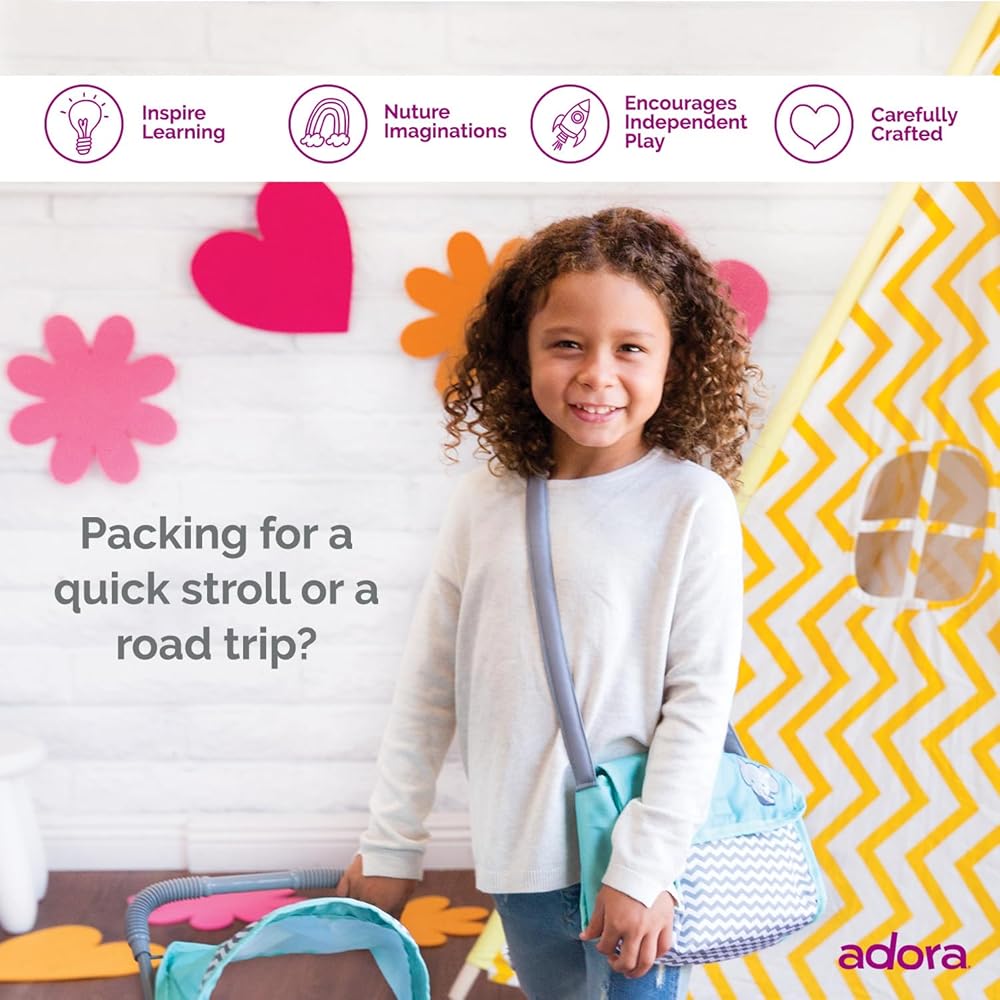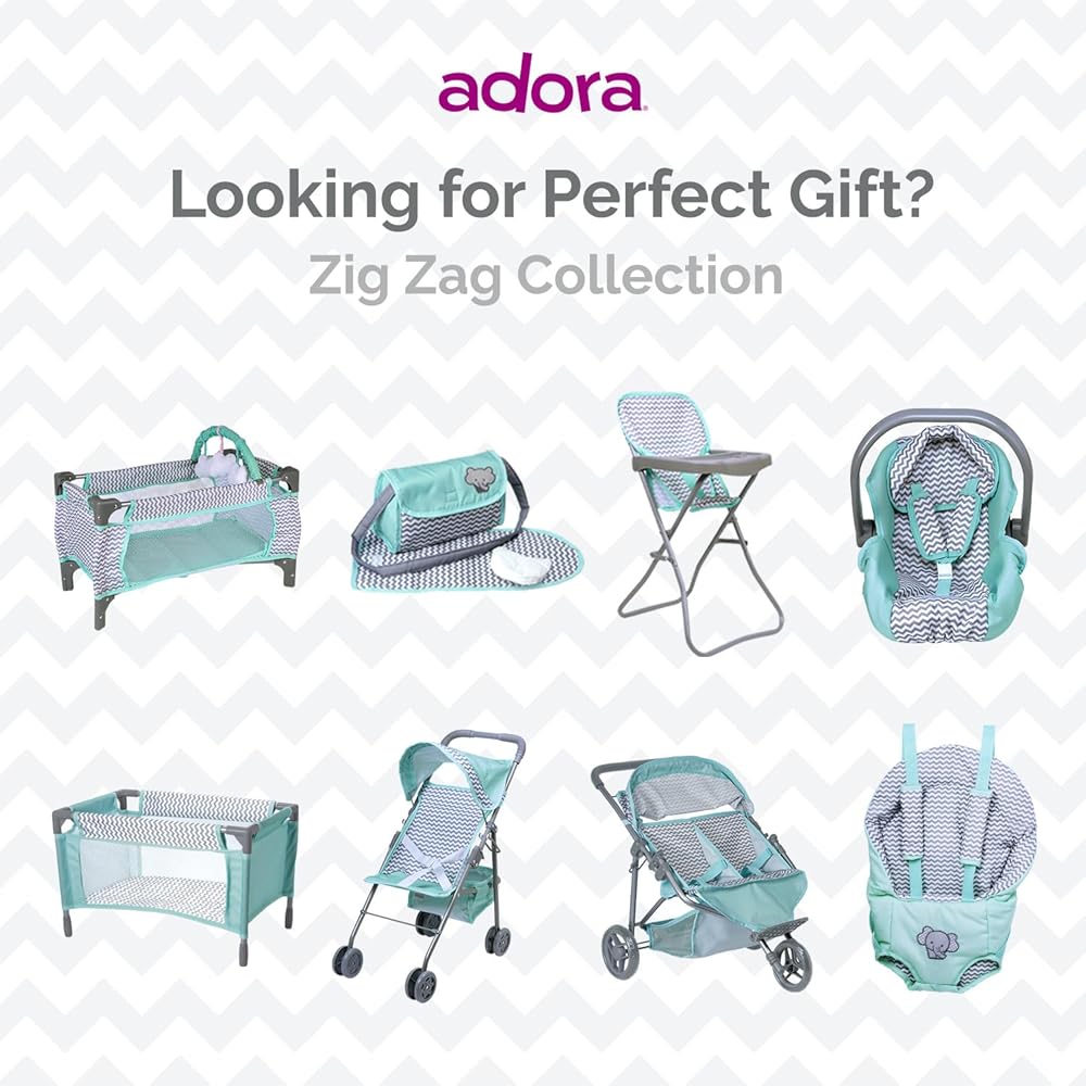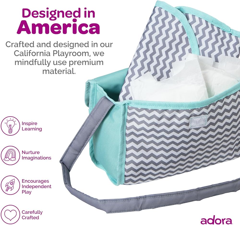 Introducing Adora's Zig Zag Diaper Bag – the ultimate accessory for little parents on-the-go! This gender-neutral bag boasts a stylish zig zag print in mint, white, and gray, complete with an embroidered elephant face. Equipped with a Velcro flap for easy access, a sturdy strap for portability, and a matching changing mat, this bag is perfect for 13-inch baby dolls. Fuel hours of interactive nurturing and imaginative play with this essential accessory, encouraging responsibility and creativity in every adventure.