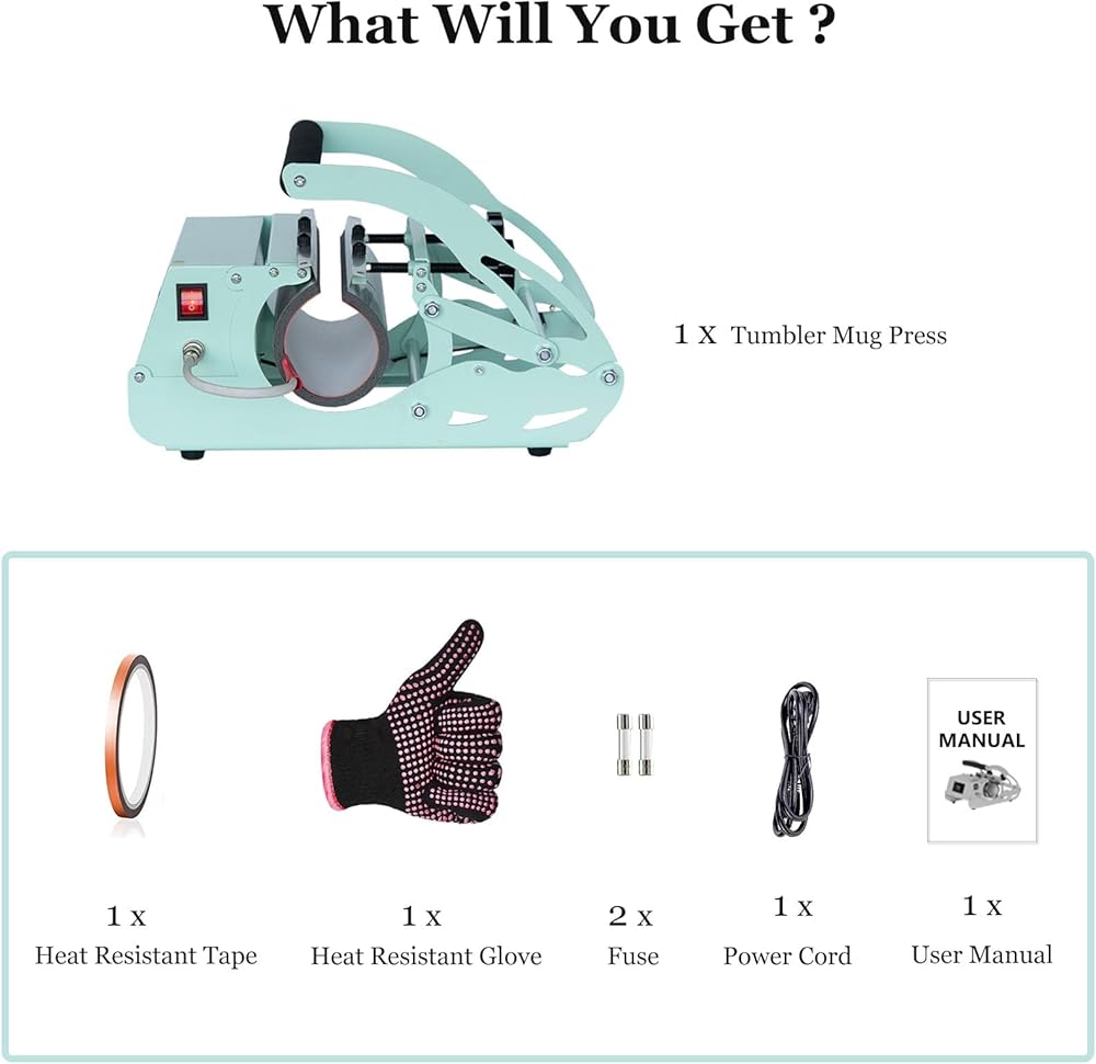 【Easy To Use & Safe】The operation screen of our Tumbler Heat Press Machine is the latest digital screen, which can accurately control the temperature and time .And the cup heat press is equipped with two pressure and diameter adjustment knobs. You can adjust the knobs to adapt to the printing of different sizes of cups; Built in fuse, very friendly to beginners. The enclosed insulated gloves can also prevent you from getting burned during operation.