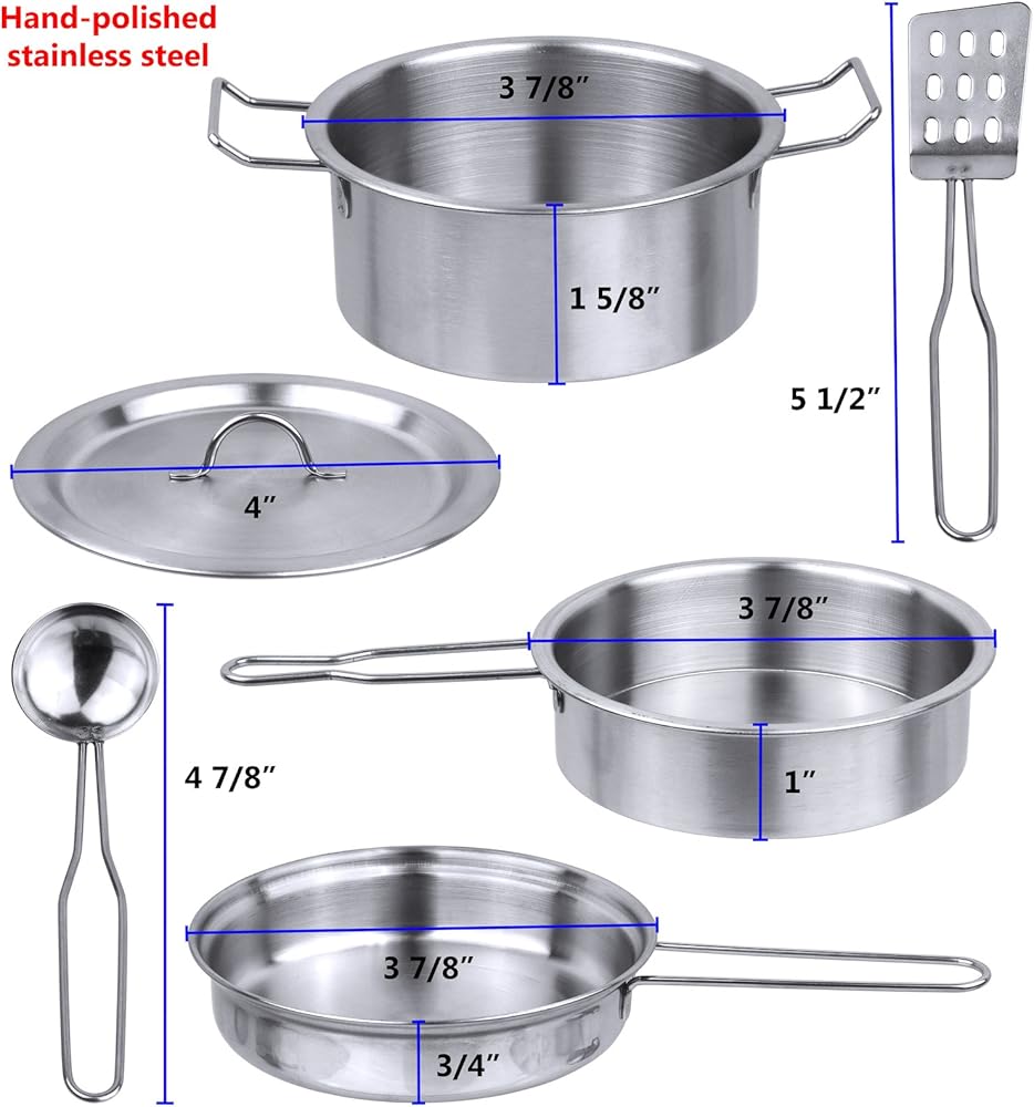 Complete Pretend Play Stainless Steel Cooking Set: This set includes 1 pot with lid, 1 pan, 1 frying pan, 1 soup ladle, 1 spatula and 6 colorful play food.Pot and pans measure 4" inches in diameter.