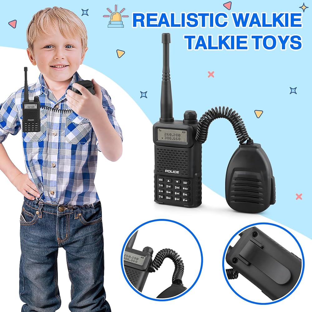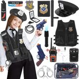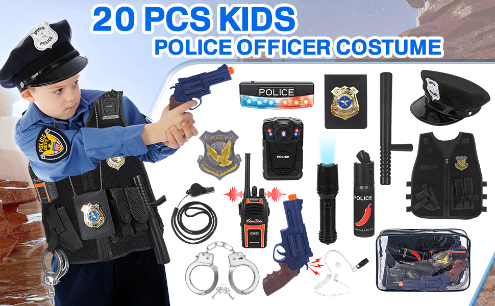 👮【ALL-IN-ONE KIDS POLICE OFFICER COSTUME】IVENRXIU deluxe kids police costume set includes a police vest, hat, toy gun, real usable walkie-talkie & flashlight, warning light, law enforcement recorder, handcuffs, keys, baton, chili spray, headphone, whistle, badge, wallet, lanyard and card, storage bag. As many as 20 accessories! The accessories are fully functional and absolutely meet all the needs of your little police officer!