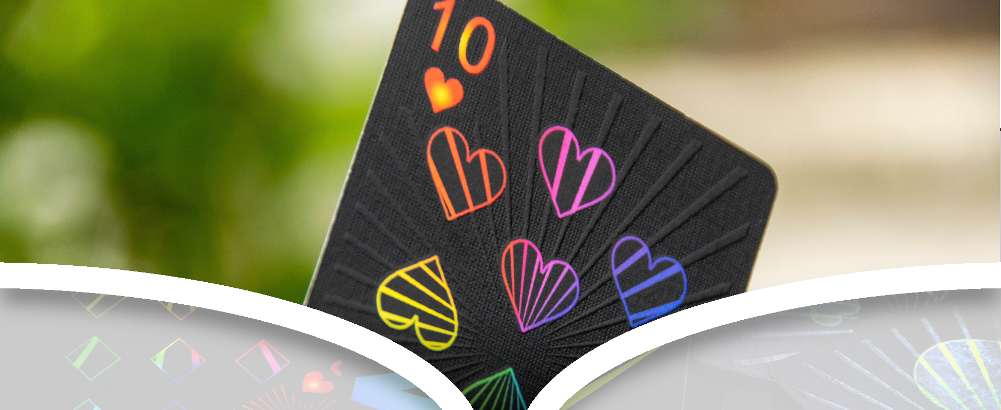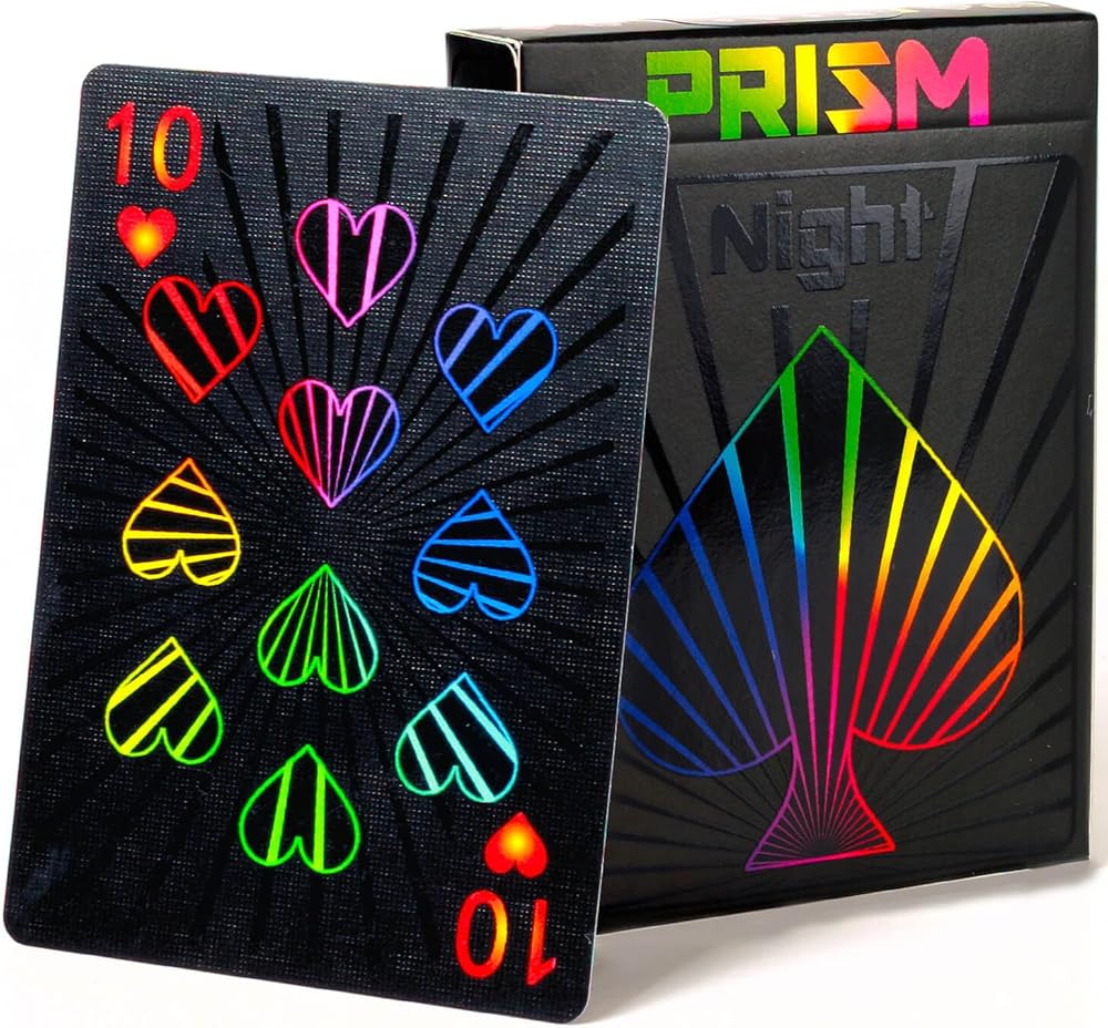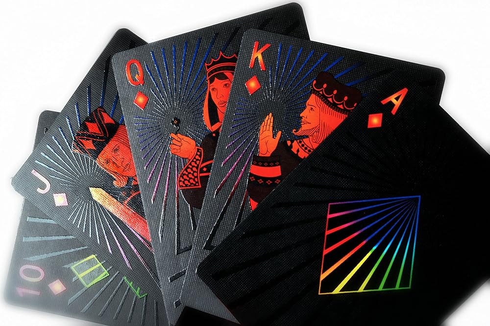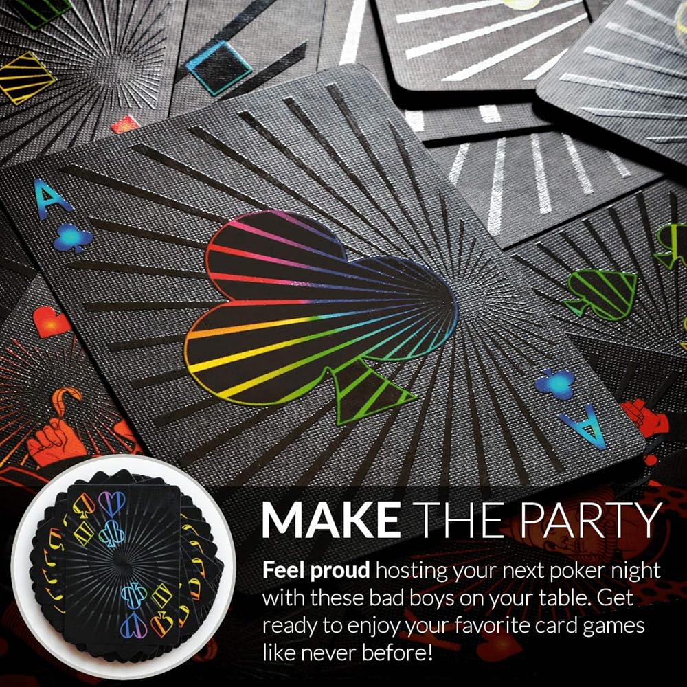 STUNNING NIGHT THEME - Deal the next hand in style with a one-of-kind card deck. A subtle black matte finish background paired with our beautiful mix of high gloss accents the sleek black-on-black finish and rainbow bursts