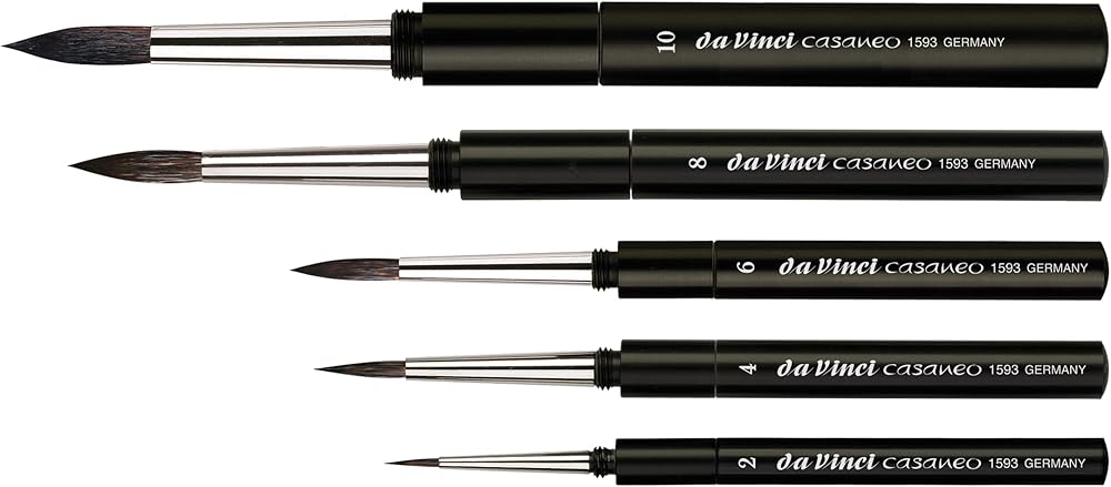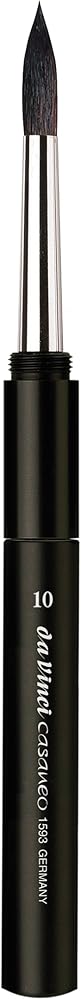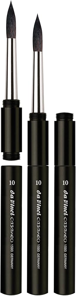 da Vinci's newest synthetic travel brush, features the first wavy fiber synthetic called Casaneo. The brush is 100% vegan and is a favorite for watercolor, gouache, urban sketching, illustration, painting with inks or dyes and fluid acylics. The brush has a flawless design as it screws together protecting the brush head for safe travels. It also has a drying hole so the brush will dry. Fits easily in a pocket or any painting set. Made in Germany by da Vinci.