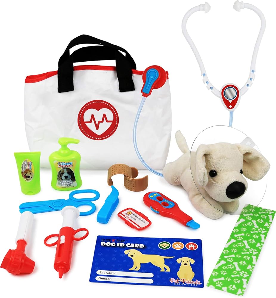 💪 BUILT TO LAST - Crafted to withstand active play, this vet set is made from high-quality materials, ensuring hours of engaging and lasting fun for your child. Includes a Plush Puppy, Dog Bag, Stethoscope and other high quality pretend vet doctor tools.