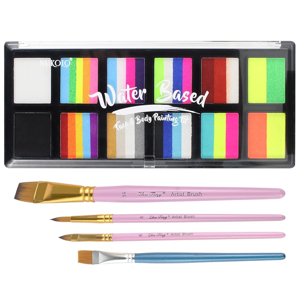 🎨PROFESSIONAL FACE PAINTING KIT: Our face paint is infused with 18 pressed ultra pigmented water based colors for face & body paint art works. Moreover, this kit also packed with 10 different shape paint brushes, offering you a big chance to create endless artistic makeup looks with you unlimited imagination.