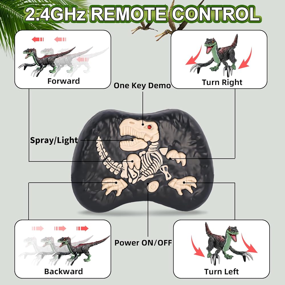 【Flexible Walking Dinosaur Toys】This electric dinosaur toy for kids 3-5 comes with a 2.4GHz remote control, which can easily control the dinosaur to walk, shake head, swing tail, growl, move forward, backward, turn left or right. Supports multiple sets of RC toy dino to play together without interfering. Press the "one key demo" button on the back of the dinosaur robot toy and it will walk like a real dinosaur. Stimulates children's creativity and role-playing imagination.
