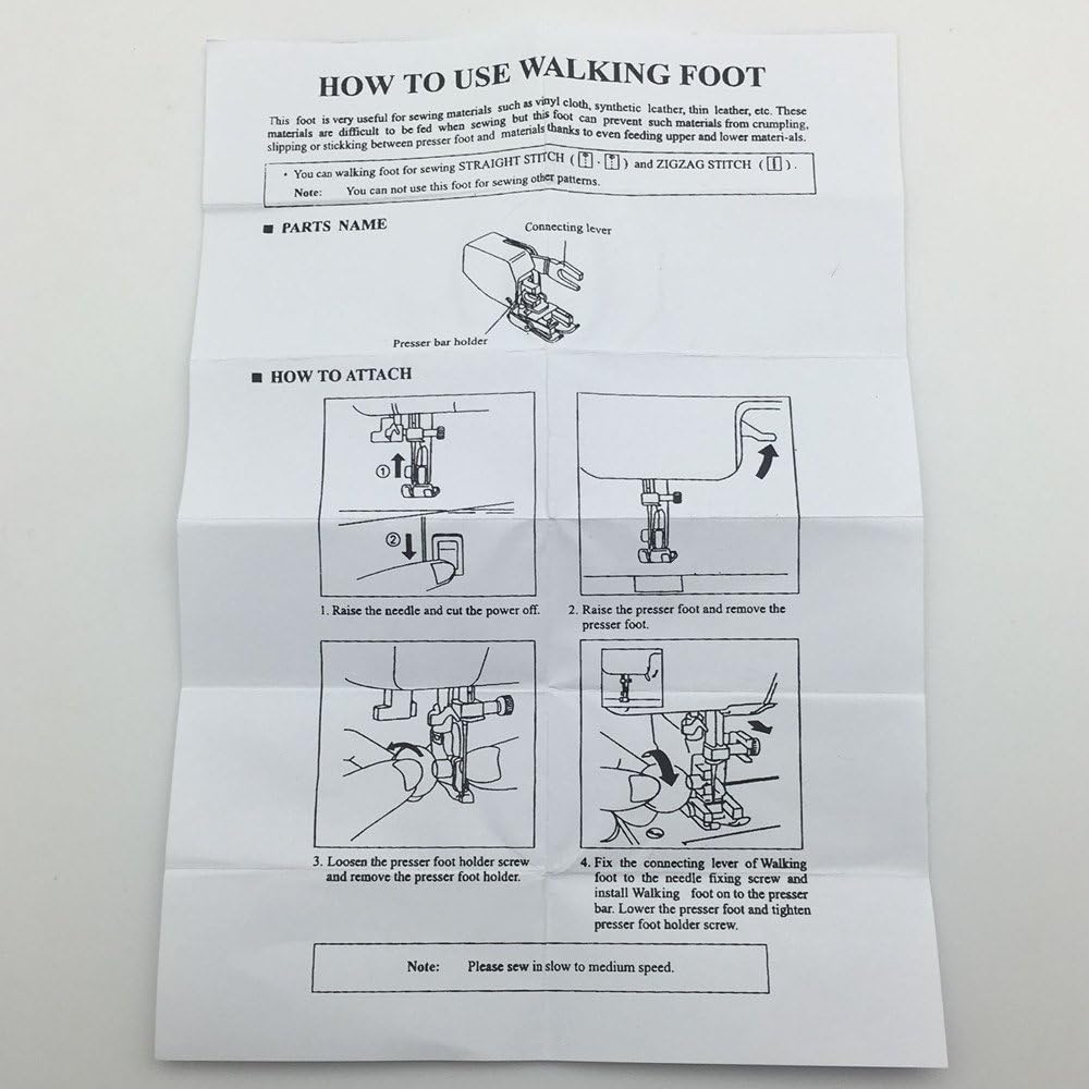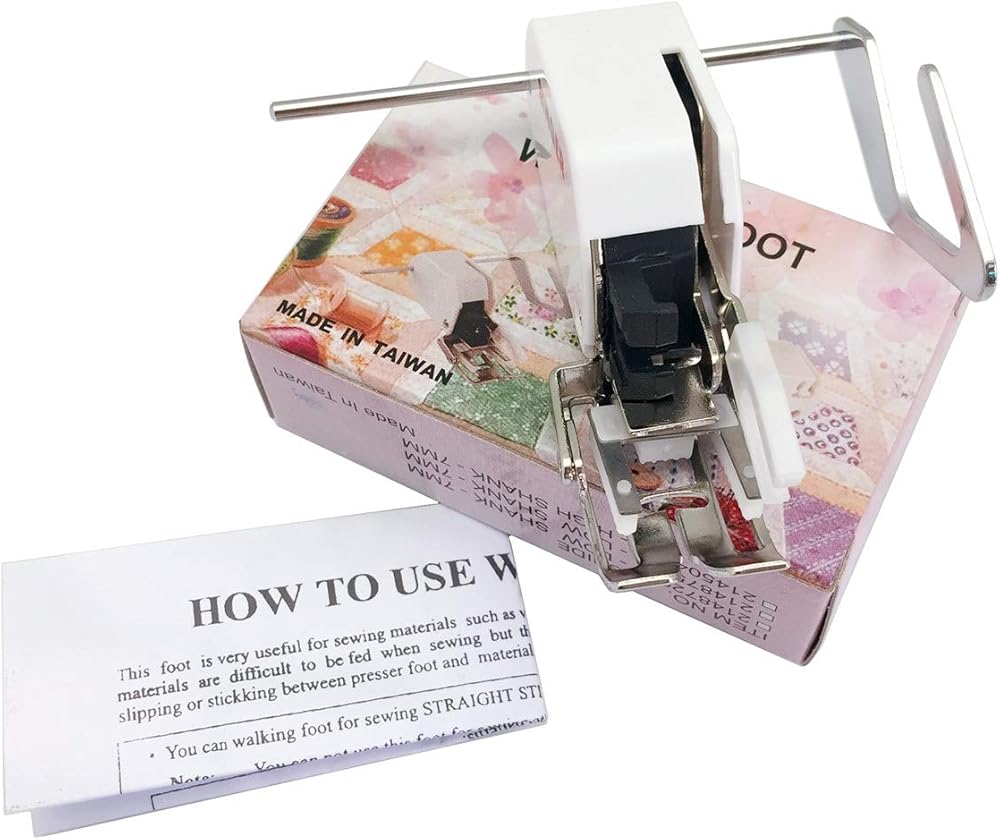The walking foot is a moving feed system that holds and moves fabric between the presser foot's upper feed dog and the machines's lower feed dogs to better control difficult fabrics as well as multiple layers of fabric.