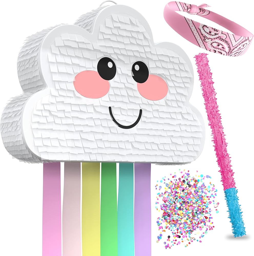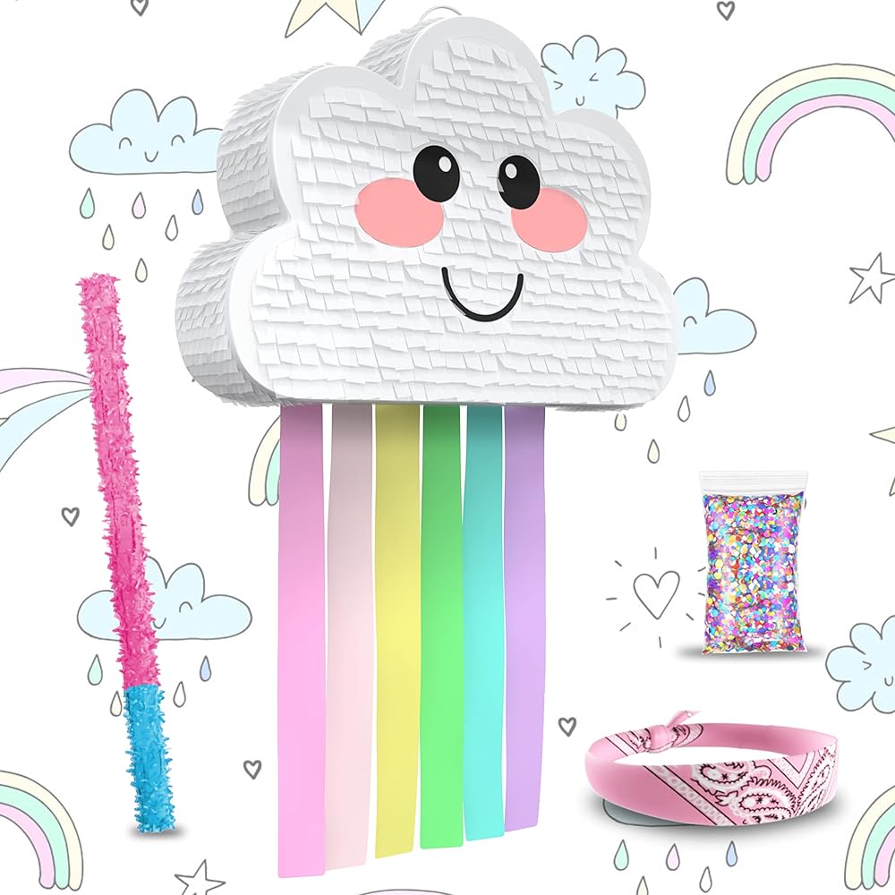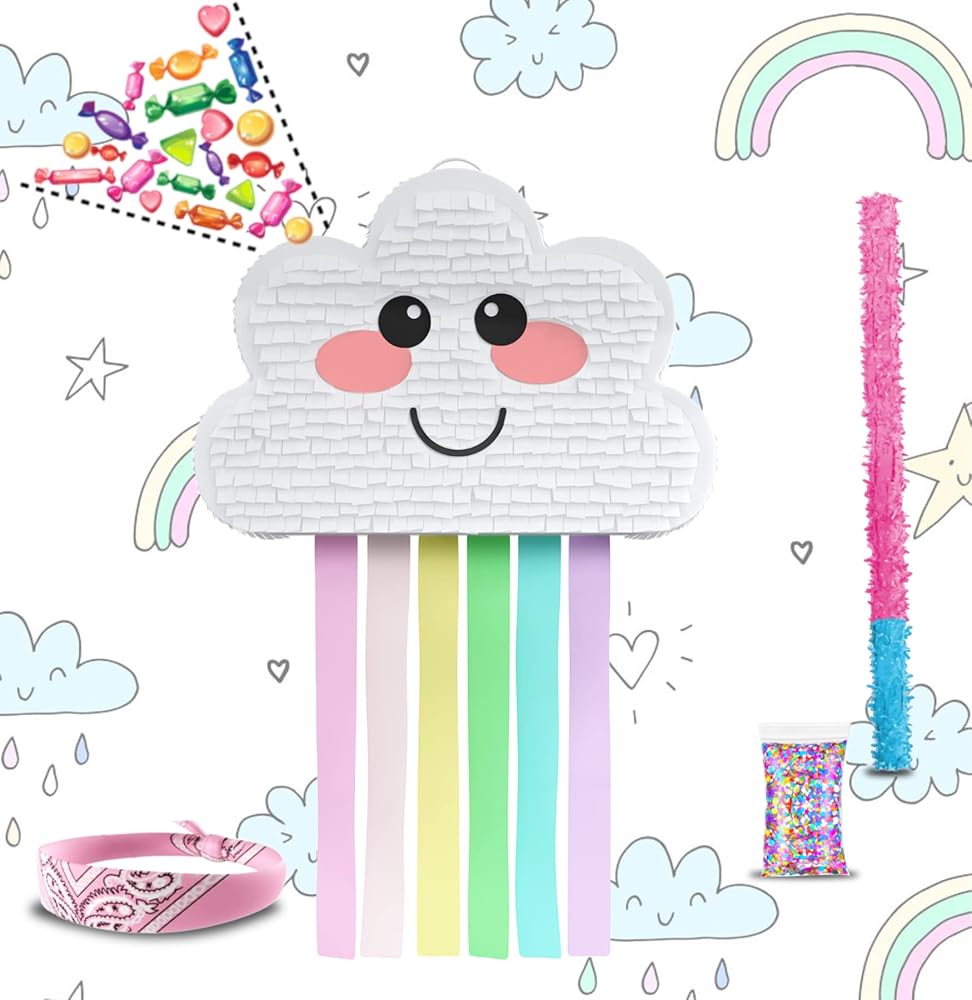 AMAZE your guests with this cute and durable 4-piece bundle Cloud and Rainbow Pinata, this item measures approximately 17.5 x 11 x 5 inches and can fit up to 2lbs of candy, this set also includes a small decorated wooden stick, a pink matching blindfold bandana, and a small multicolored confetti bag. This is the best value bundle for this type of pinata on the market!!