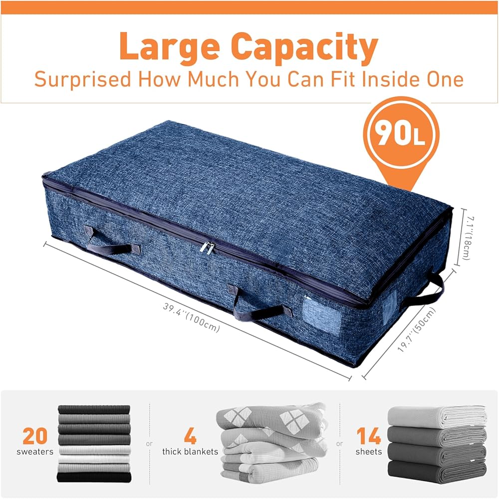★ 90L LARGE CAPACITY: Which measures 39.4"(100cm) x 19.7"(50cm) x 7.1"(18cm), surprised how much you could get in them, when you can easily put 20 sweaters, 4 thick blankets or 14 sheets in a neat and manageable way. Great storage solutions for under the bed storage.