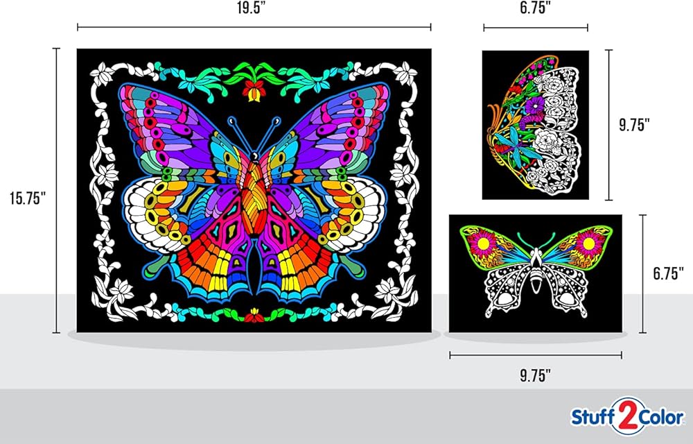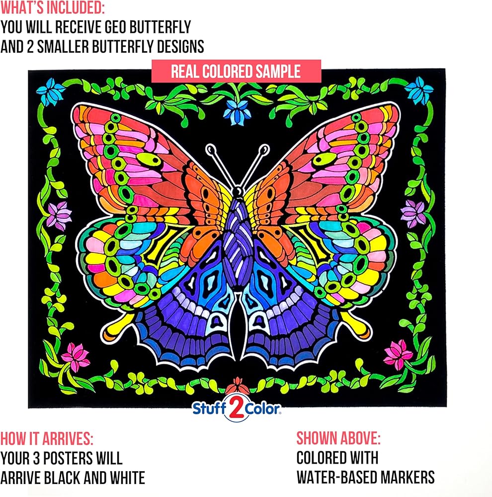 Stuff2Color Geo Butterfly - Fuzzy Coloring Poster - Includes 3 Designs to Color (1 Large, 2 Small) - for Kids, Toddlers, Kids, Teens and Adults [Beautiful Arts and Crafts Project for All Ages]