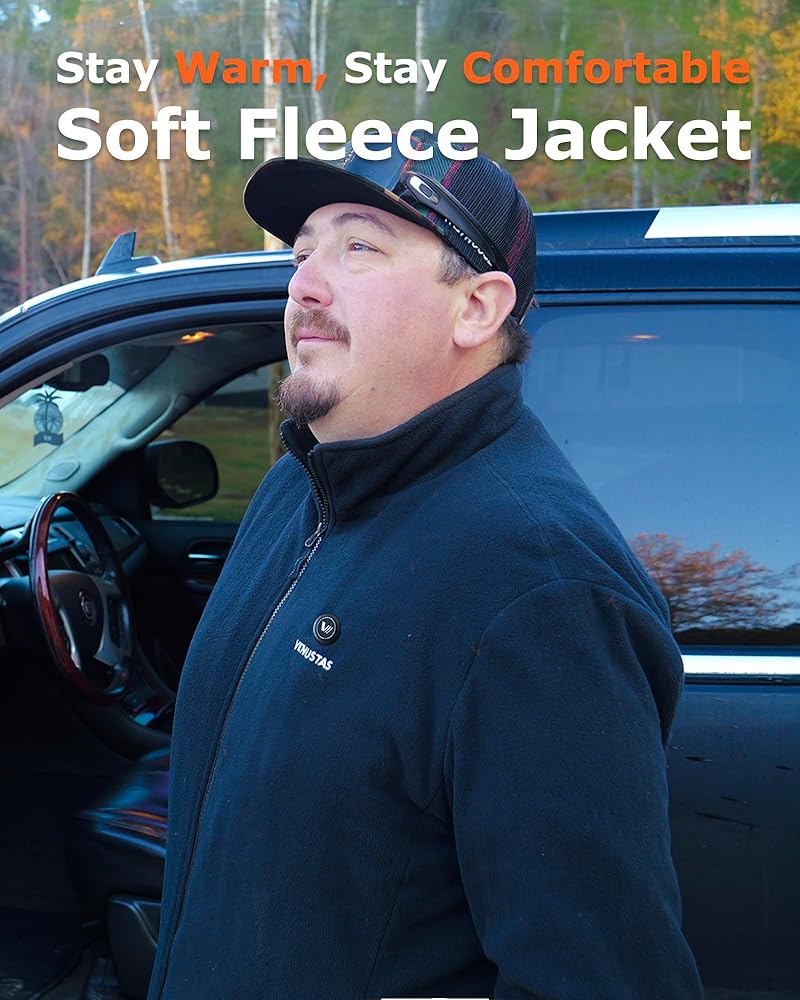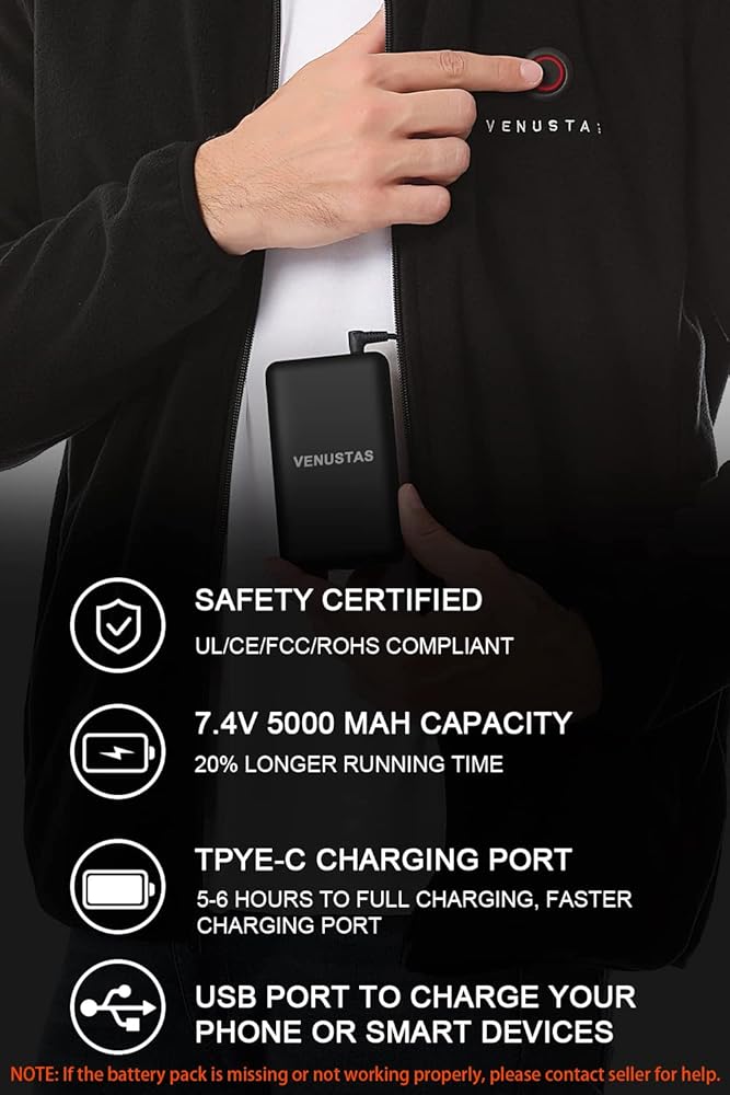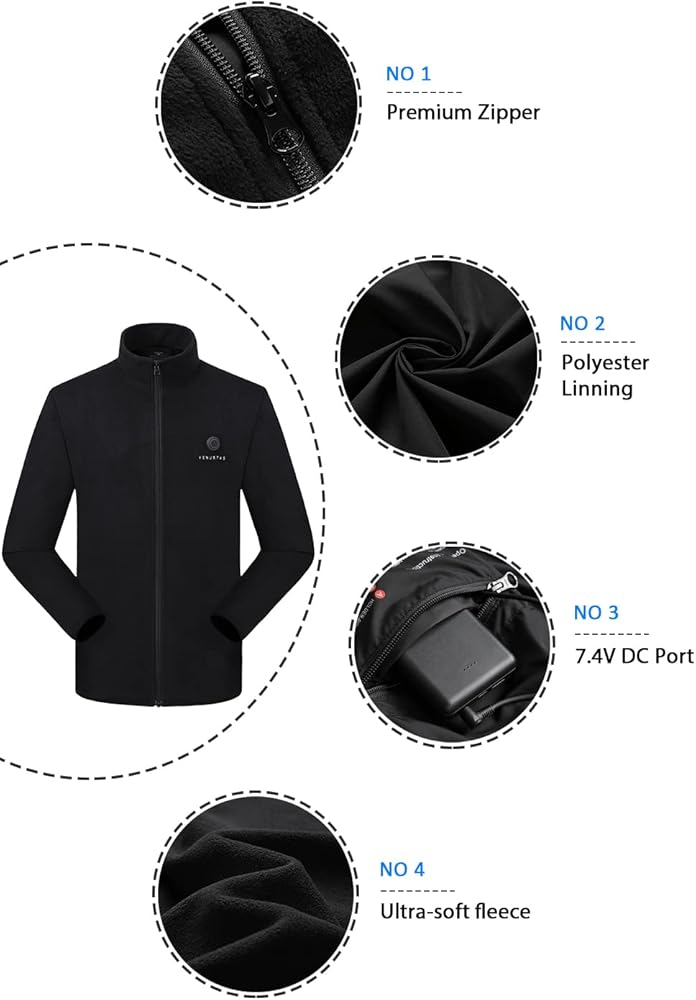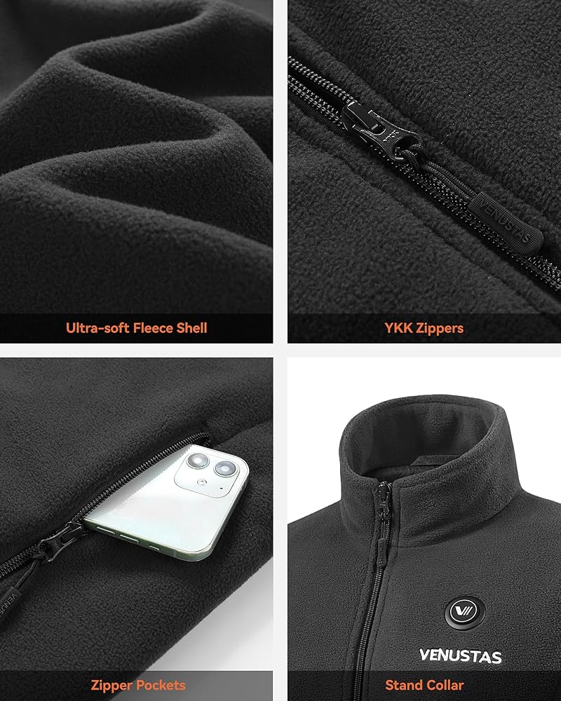 EXCELLENT HEATING PERFORMANCE: Venustas men’s heated fleece jacket adopts carbon fiber high-tech which makes it unique and better. Carbon fiber is thinner, stronger, and more flexible known thermally conductive material. It features remarkable electro and thermal conductivity, damage-proof ability. Venustas electric heated jacket takes a leap in preheat duration thanks to the great thermal conductivity. It will heat before you can notice it. Warmth spread across your body soon
