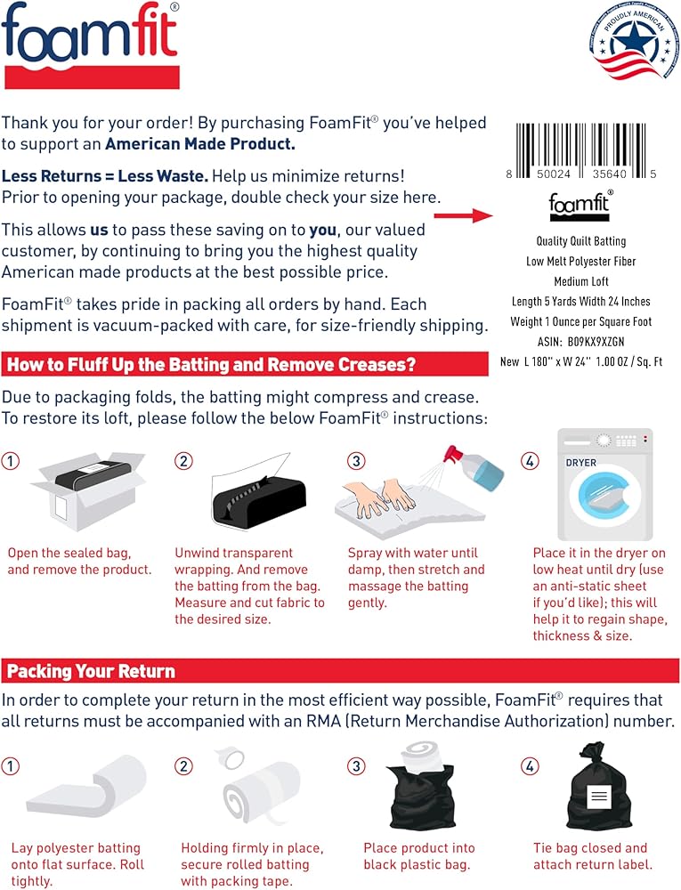 It is easy to work with and has several uses. Renew the appearance of upholstery projects. Wrap seats and cushions to reduce wear to fabric from the foam friction or filler for couch cushions for smoother edges and crown-looking. Fill throw, bolster, lumbar, and box pillow. It is UV-resistant and breathable for restoring outdoor or indoor furniture, or you can use it as padding for a softer look on motorcycles, cars, boats, airplanes, golf carts, and RV seating. Replacement for filters and aquarium filtration systems. Restore gowns, filling in jackets, cold clothing, baby blankets, and cribbing. Great for DIY projects, bedding quilts, event decorations, making stuffed animals fluffy, or filling jewelry boxes. Wrap around delicate glass or ceramic for an extra padded layer of protection