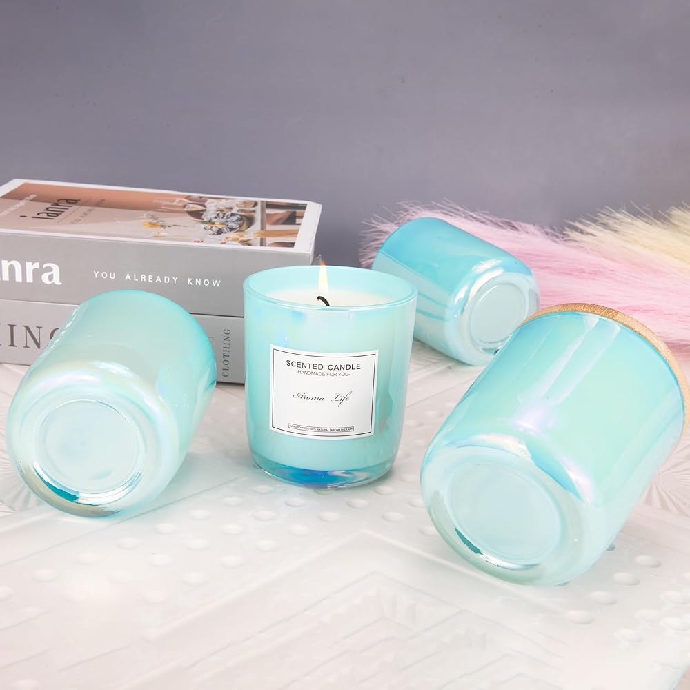 8 Pack, 10oz Iridescent Candle Glass Jars for Making Candles, Thickened Candle Containers with Bamboo Lids and Sticky Labels, Bulk Candle Vessels for Hand Candle Making DIY Craft(Aqua Iridescent)