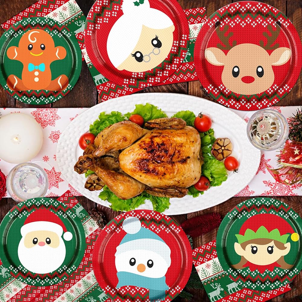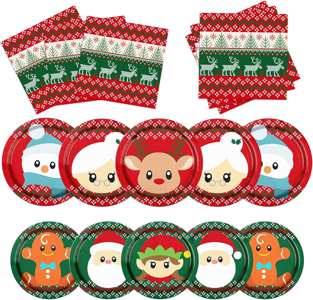 🎄【Exquisite Design】 The ugly sweater party plates and napkins featuring santa claus and reindeer tableware set with red and green as the theme color.Creating a rich party atmosphere and giving you an unforgettable party experience.