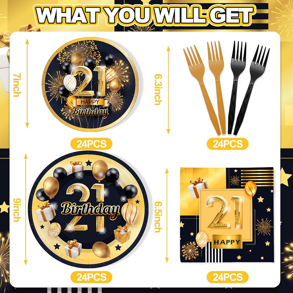 80th THEME BIRTHDAY PARTY SUPPLIES - This Black and Gold birthday party supplies includes: 24 x 9" plates, 24 x 7" plates, 24 x forks, 24 x 6.5" napkins. There are a total of 96pcs in this set, which will add fun to 80th birthday party.