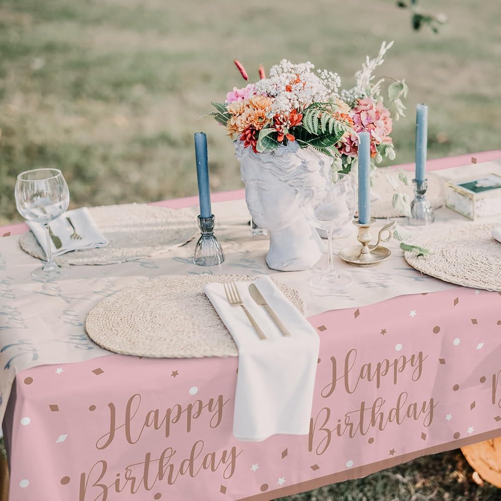 BIRTHDAY PACKAGE INCLUDING: 25*dinner paper plates (9 inches), 25*dessert paper plates (7inches), 25*napkins, 25*paper cups (9oz), 1*banner, 1*tablecloth (54*108inches),4*Rose Gold balloons,4*white balloons, 4* Rose Gold confetti latex balloons