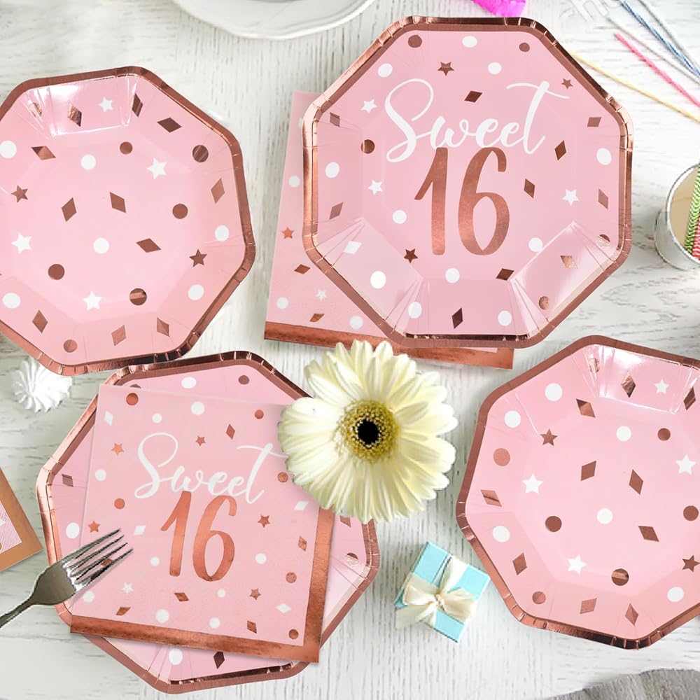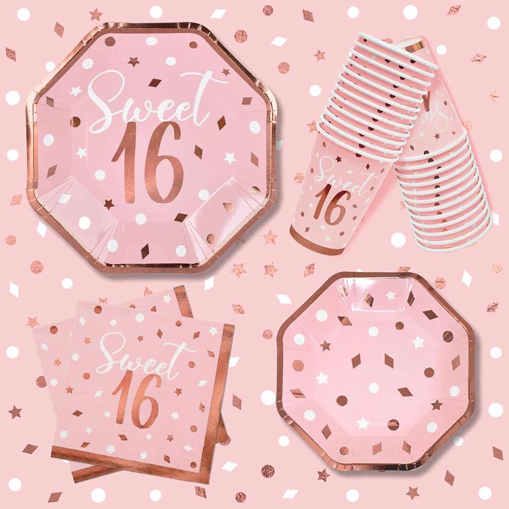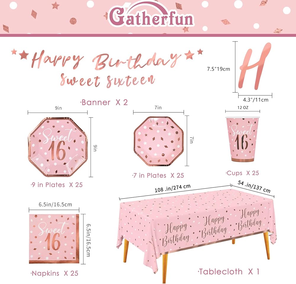 Rose Gold & Pink Sweet 16 Birthday Bundle: Party Supplies Set with paper Plates, Napkins, Cups, Tablecloth & Banner - Sweet Sixteen Decorations, Party Favors ,Serves 25
